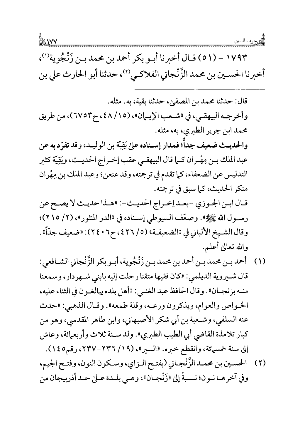 ١٧٩٣ - (٥١) قال أخبرنا أبو بكر أحمد بن محمد بن زَنْجُوية (¬١)، أخبرنا الحسين بن محمد الزَّنْجاني الفلاكي (¬٢)، حدثنا أبو الحارث علي بن