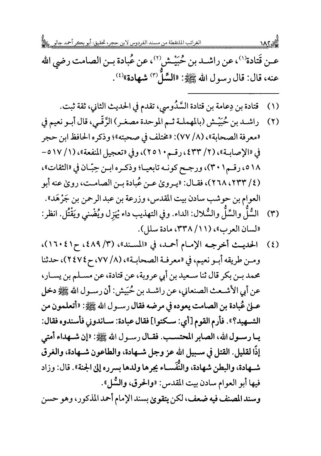 عن قَتادة (¬١)، عن راشد بن حُبَيْش (¬٢)، عن عُبادة بن الصامت رضي اللَّه عنه، قال: قال رسول اللَّه -صلى اللَّه عليه وسلم-: "السِّلُّ (¬٣) شهادة" (¬٤).
