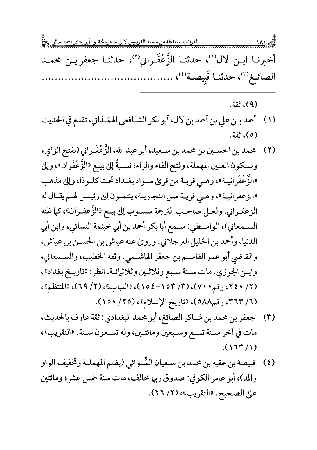 (¬٢) محمد بن الحسين بن محمد بن سعيد، أبو عبد اللَّه، الزَّعْفَراني (بفتح الزاي، وسكون العين المهملة، وفتح الفاء والراء، نسبةً إلى بيع "الزَّعْفَران"، وإلى "الزَّعْفَرانية"، وهي قرية من قرى سواد بغداد تحت كلوذا، وإلى مذهب "الزعفرانية"، وهي قرية من النجارية، ينتمون إلى رئيس لهم يقال له الزعفراني. ولعل صاحب الترجمة منسوب إلى بيع "الزَّعفران"، كما ظنه السمعاني)، الواسطي: سمع أبا بكر أحمد بن أبي خيثمة النسائي، وابن أبي الدنيا، وأحمد بن الخليل البرجلاني. وروى عنه عياش بن الحسن بن عياش، والقاضي أبو عمر القاسم بن جعفر الهاشمي. وثقه الخطيب، والسمعاني، وابن الجوزي. مات سنة سبع وثلاثين وثلاثمائة. انظر: "تاريخ بغداد"، (٢/ ٢٤٠، رقم ٧٠٠)، (٣/ ١٥٣ - ١٥٤)، "اللباب"، (٢/ ٦٩)، "المنتظم"، (٦/ ٣٦٣، رقم ٥٨٨)، "تاريخ الإسلام"، (٢٥/ ١٥٠).