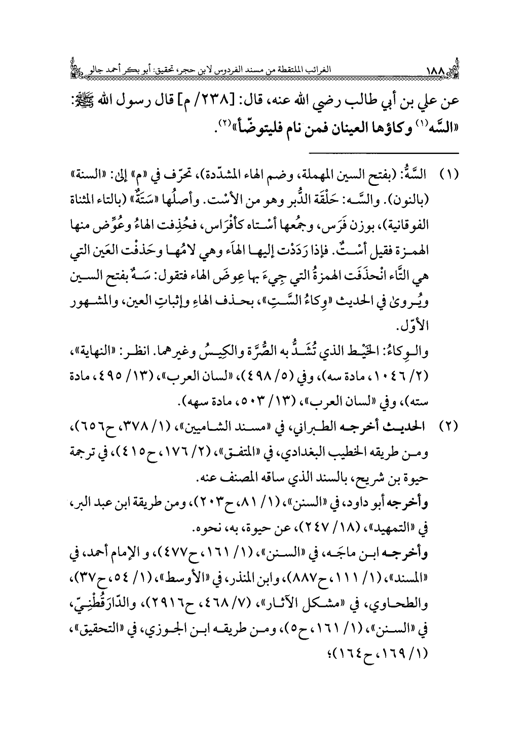 عن علي بن أبي طالب رضي اللَّه عنه، قال: قال رسول اللَّه -صلى اللَّه عليه وسلم-: "السَّه (¬١) وكاؤها العينان فمن نام فليتوضّأ" (¬٢).