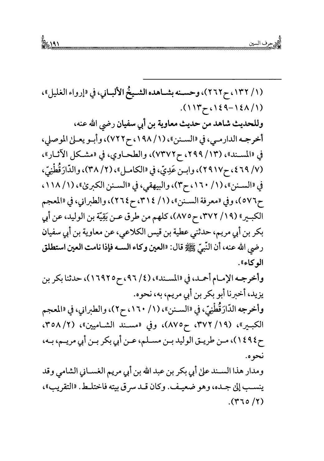 أخرجه الدارمي، في "السنن"، (١/ ١٩٨، ح ٧٢٢)، وأبو يعلى الموصلي، في "المسند"، (١٣/ ٢٩٩، ح ٧٣٧٢)، والطحاوي، في "مشكل الآثار"، (٧/ ٤٦٩، ح ٢٩١٧)، وابن عَدِيّ، في "الكامل"، (٢/ ٣٨)، والدّارَقُطْنِيّ، في "السنن"، (١/ ١٦٠، ح ٣)، والبيهقي، في "السنن الكبرى"، (١/ ١١٨، ح ٥٧٦)، وفي "معرفة السنن"، (١/ ٣١٤، ح ٢٦٤)، والطبراني، في "المعجم الكبير" (١٩/ ٣٧٢، ح ٨٧٥)، كلهم من طرق عن بَقِيّة بن الوليد، عن أبي بكر بن أبي مريم، حدثني عطية بن قيس الكلاعي، عن معاوية بن أبي سفيان رضي اللَّه عنه، أن النّبيّ -صلى اللَّه عليه وسلم- قال: "العين وكاء السه فإذا نامت العين استطلق الوكاء".