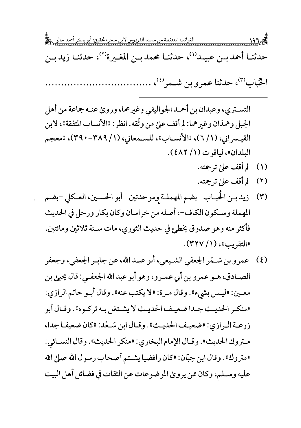 حدثنا أحمد بن عبيد (¬١)، حدثنا محمد بن المغيرة (¬٢)، حدثنا زيد بن الحُباب (¬٣)، حدثنا عمرو بن شمر (¬٤)، . . . . . . .