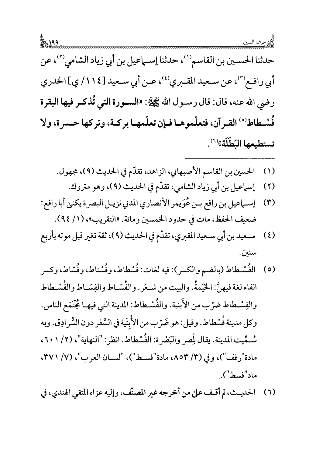 حدثنا الحسين بن القاسم (¬١)، حدثنا إسماعيل بن أبي زياد الشامي (¬٢)، عن أبي رافع (¬٣)، عن سعيد المقبري (¬٤)، عن أبي سعيد الخدري رضي اللَّه عنه، قال: قال رسول اللَّه -صلى اللَّه عليه وسلم-: "السورة التي تُذكر فيها البقرة فُسْطاط (¬٥) القرآن، فتعلّموها فإن تعلّمها بركة، وتركها حسرة، ولا تستطيعها البَطَلَة" (¬٦).