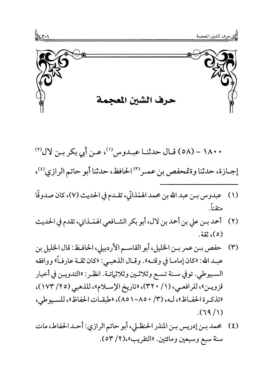 ١٨٠٠ - (٥٨) قال حدثنا عبدوس (¬١)، عن أبي بكر بن لال (¬٢) إجازة، حدثنا حفص بن عمر (¬٣) الحافظ، حدثنا أبو حاتم الرازي (¬٤)،