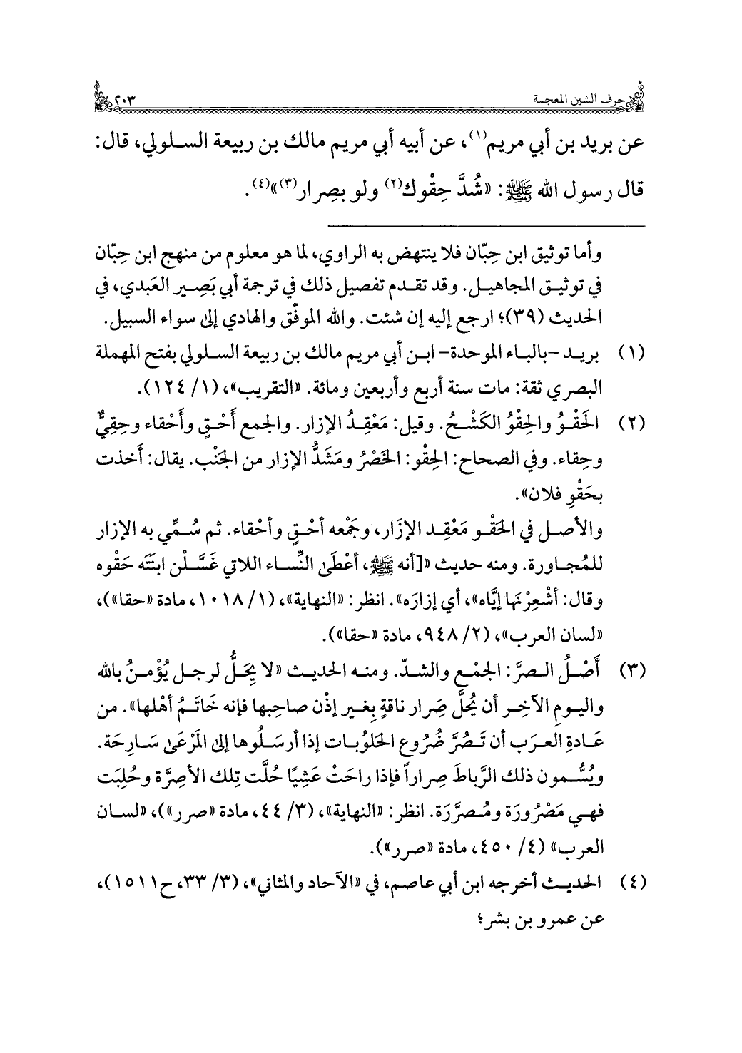 عن بريد بن أبي مريم (¬١)، عن أبيه أبي مريم مالك بن ربيعة السلولي، قال: قال رسول اللَّه -صلى اللَّه عليه وسلم-: "شُدَّ حِقْوك (¬٢) ولو بصِرار (¬٣) " (¬٤).