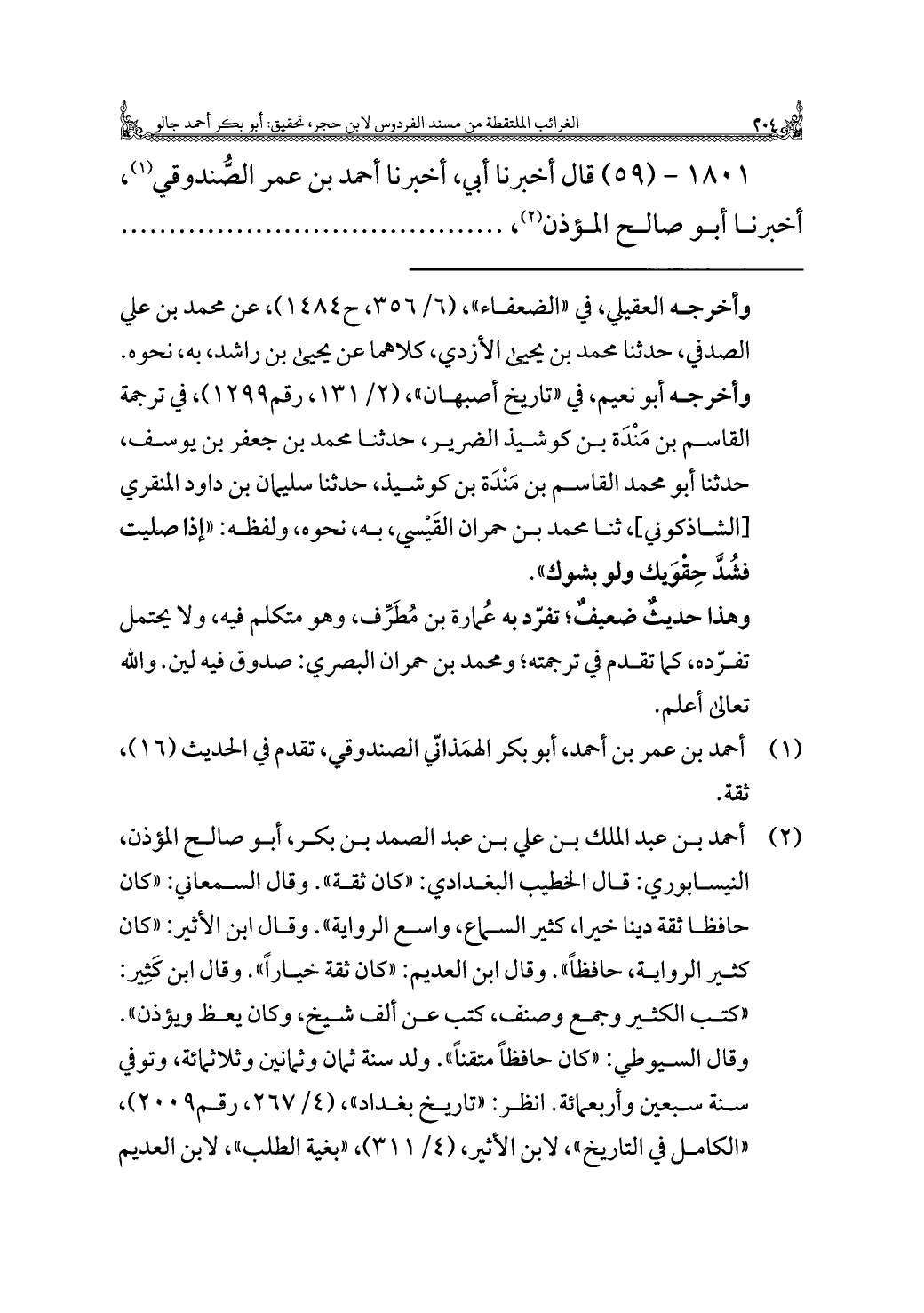١٨٠١ - (٥٩) قال أخبرنا أبي، أخبرنا أحمد بن عمر الصُّندوقي (¬١)، أخبرنا أبو صالح المؤذن (¬٢)، . . . . . .
