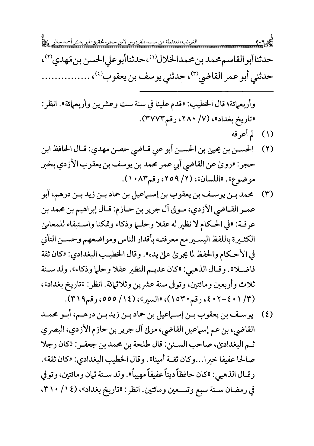 حدثنا أبو القاسم محمد بن محمد الخلال (¬١)، حدثنا أبو علي الحسن بن مَهدي (¬٢)، حدثني أبو عمر القاضي (¬٣)، حدثني يوسف بن يعقوب (¬٤)، . . . . . .