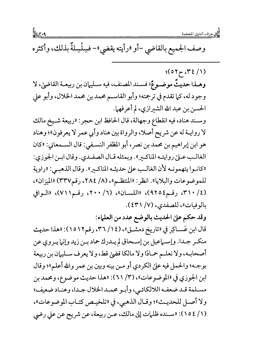 قال ابن عَساكِر في "تاريخ دمشق"، (١٤/ ٣٦، رقم ١٥١٢): "هذا حديث منكر جدا. وإسماعيل بن إسحاق لم يدرك حماد بن زيد وإنما يروي عن أصحابه، ولا نعلم حمادًا ولا مالكا قضى قط، ولا يعرف سليمان بن ربيعة بوجه؛ والحمل فيه على الكردي أو من بينه وبين بن عمر واللَّه أعلم"؛ وقال ابن الجوزي في "الموضوعات"، (٣/ ٦١): "هذا حديث موضوع، ومحمد بن مسلمة قد ضعفه اللالكائي، وأبو محمد الخلال جدا، وهناد ضعيف؛ ولا أصل للحديث"؛ وقال الذهبي، في "تلخيص كتاب الموضوعات"، (١/ ١٥٤): "سنده ظلمات إلى مالك، عن ربيعة، عن شريح عن علي رضي =