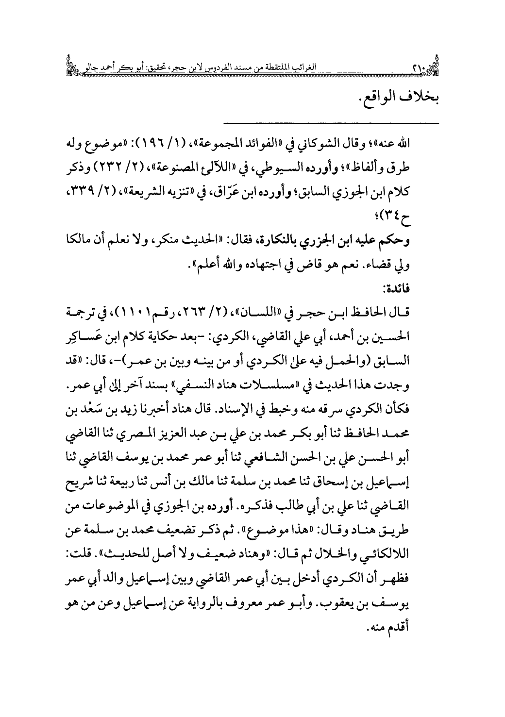 قال الحافظ ابن حجر في "اللسان"، (٢/ ٢٦٣، رقم ١١٠١)، في ترجمة الحسين بن أحمد، أبي علي القاضي، الكردي: -بعد حكاية كلام ابن عَساكِر السابق (والحمل فيه على الكردي أو من بينه وبين ابن عمر) -، قال: "قد وجدت هذا الحديث في "مسلسلات هناد النسفي" بسند آخر إلى أبي عمر. فكأن الكردي سرقه منه وخبط في الإسناد. قال هناد أخبرنا زيد بن سَعْد بن محمد الحافظ ثنا أبو بكر محمد بن علي بن عبد العزيز المصري ثنا القاضي أبو الحسن علي بن الحسن الشافعي ثنا أبو عمر محمد بن يوسف القاضي ثنا إسماعيل بن إسحاق ثنا محمد بن سلمة ثنا مالك بن أنس ثنا ربيعة ثنا شريح القاضي ثنا علي بن أبي طالب فذكره. أورده بن الجوزي في الموضوعات من طريق هناد وقال: "هذا موضوع". ثم ذكر تضعيف محمد بن سلمة عن اللالكائي والخلال ثم قال: "وهناد ضعيف ولا أصل للحديث". قلت: فظهر أن الكردي أدخل بين أبي عمر القاضي وبين إسماعيل والد أبي عمر يوسف بن يعقوب. وأبو عمر معروف بالرواية عن إسماعيل وعن من هو أقدم منه.