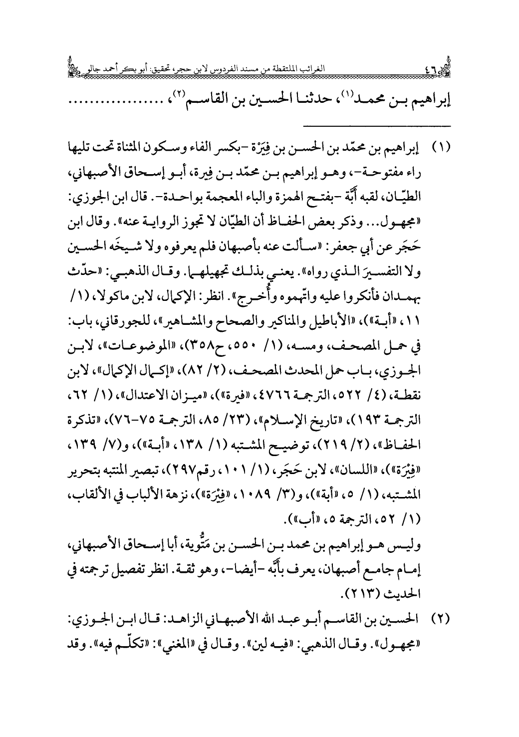 (¬١) إبراهيم بن محمّد بن الحسن بن فِيَرْة -بكسر الفاء وسكون المثناة تحت تليها راء مفتوحة-، وهو إبراهيم بن محمّد بن فِيرة، أبو إسحاق الأصبهاني، الطيّان، لقبه أَبَّة -بفتح الهمزة والباء المعجمة بواحدة-. قال ابن الجوزي: "مجهول. . . وذكر بعض الحفاظ أن الطيّان لا تجوز الرواية عنه". وقال ابن حَجَر عن أبي جعفر: "سألت عنه بأصبهان فلم يعرفوه ولا شيخَه الحسين ولا التفسيرَ الذي رواه". يعني بذلك تجهيلهما. وقال الذهبي: "حدّث بهمدان فأنكروا عليه واتّهموه وأُخرج". انظر: الإكمال، لابن ماكولا، (١/ ١١، "أبة")، "الأباطيل والمناكير والصحاح والمشاهير"، للجورقاني، باب: في حمل المصحف، ومسه، (١/ ٥٥٠، ح ٣٥٨)، "الموضوعات"، لابن الجوزي، باب حمل المحدث المصحف، (٢/ ٨٢)، "إكمال الإكمال"، لابن نقطة، (٤/ ٥٢٢، الترجمة ٤٧٦٦، "فيرة")، "ميزان الاعتدال"، (١/ ٦٢، الترجمة ١٩٣)، "تاريخ الإسلام"، (٢٣/ ٨٥، الترجمة ٧٥ - ٧٦)، "تذكرة الحفاظ"، (٢/ ٢١٩)، توضيح المشتبه (١/ ١٣٨، "أبة")، و (٧/ ١٣٩، "فِيْرَة")، "اللسان"، لابن حَجَر، (١/ ١٠١، رقم ٢٩٧)، تبصير المنتبه بتحرير المشتبه، (١/ ٥، "أبة")، و (٣/ ١٠٨٩، "فِيْرَة")، نزهة الألباب في الألقاب، (١/ ٥٢، الترجمة ٥، "أب").