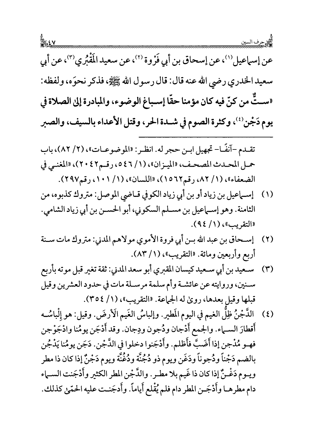 عن إسماعيل (¬١)، عن إسحاق بن أبي فَرْوة (¬٢)، عن سعيد المَقْبُري (¬٣)، عن أبي سعيد الخدري رضي اللَّه عنه قال: قال رسول اللَّه -صلى اللَّه عليه وسلم-، فذكر نحوَه، ولفظه: "ستّ من كنّ فيه كان مؤمنا حقّا إسباغ الوضوء، والمبادرة إلى الصلاة في يوم دَجْن (¬٤)، وكثرة الصوم في شدة الحر، وقتل الأعداء بالسيف، والصبر