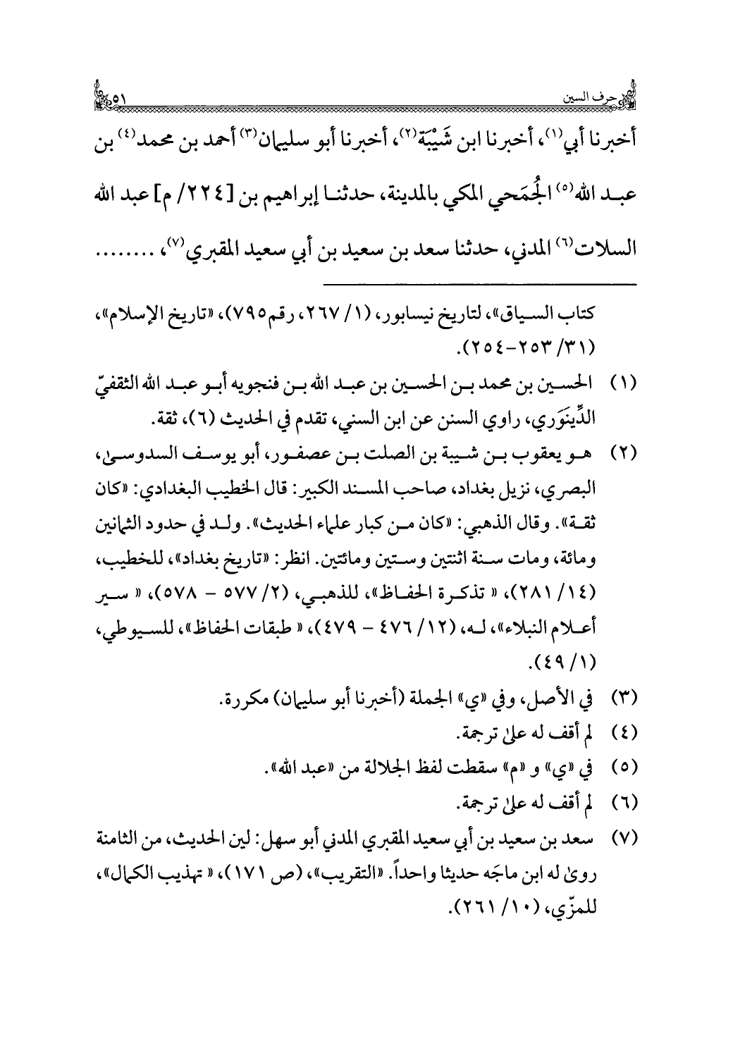 (¬٢) هو يعقوب بن شيبة بن الصلت بن عصفور، أبو يوسف السدوسي، البصري، نزيل بغداد، صاحب المسند الكبير: قال الخطيب البغدادي: "كان ثقة". وقال الذهبي: "كان من كبار علماء الحديث". ولد في حدود الثمانين ومائة، ومات سنة اثنتين وستين ومائتين. انظر: "تاريخ بغداد"، للخطيب، (١٤/ ٢٨١)، "تذكرة الحفاظ"، للذهبي، (٢/ ٥٧٧ - ٥٧٨)، "سير أعلام النبلاء"، له، (١٢/ ٤٧٦ - ٤٧٩)، "طبقات الحفاظ"، للسيوطي، (١/ ٤٩).