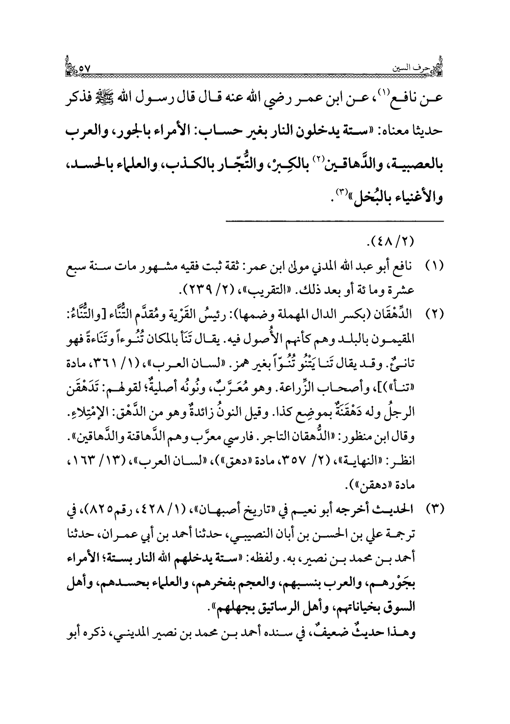عن نافع (¬١)، عن ابن عمر رضي اللَّه عنه قال قال رسول اللَّه -صلى اللَّه عليه وسلم- فذكر حديثًا معناه: "ستة يدخلون النار بغير حساب: الأمراء بالجور، والعرب بالعصبية، والدَّهاقين (¬٢) بالكِبرْ، والتُّجّار بالكذب، والعلماء بالحسد، والأغنياء بالبُخل" (¬٣).