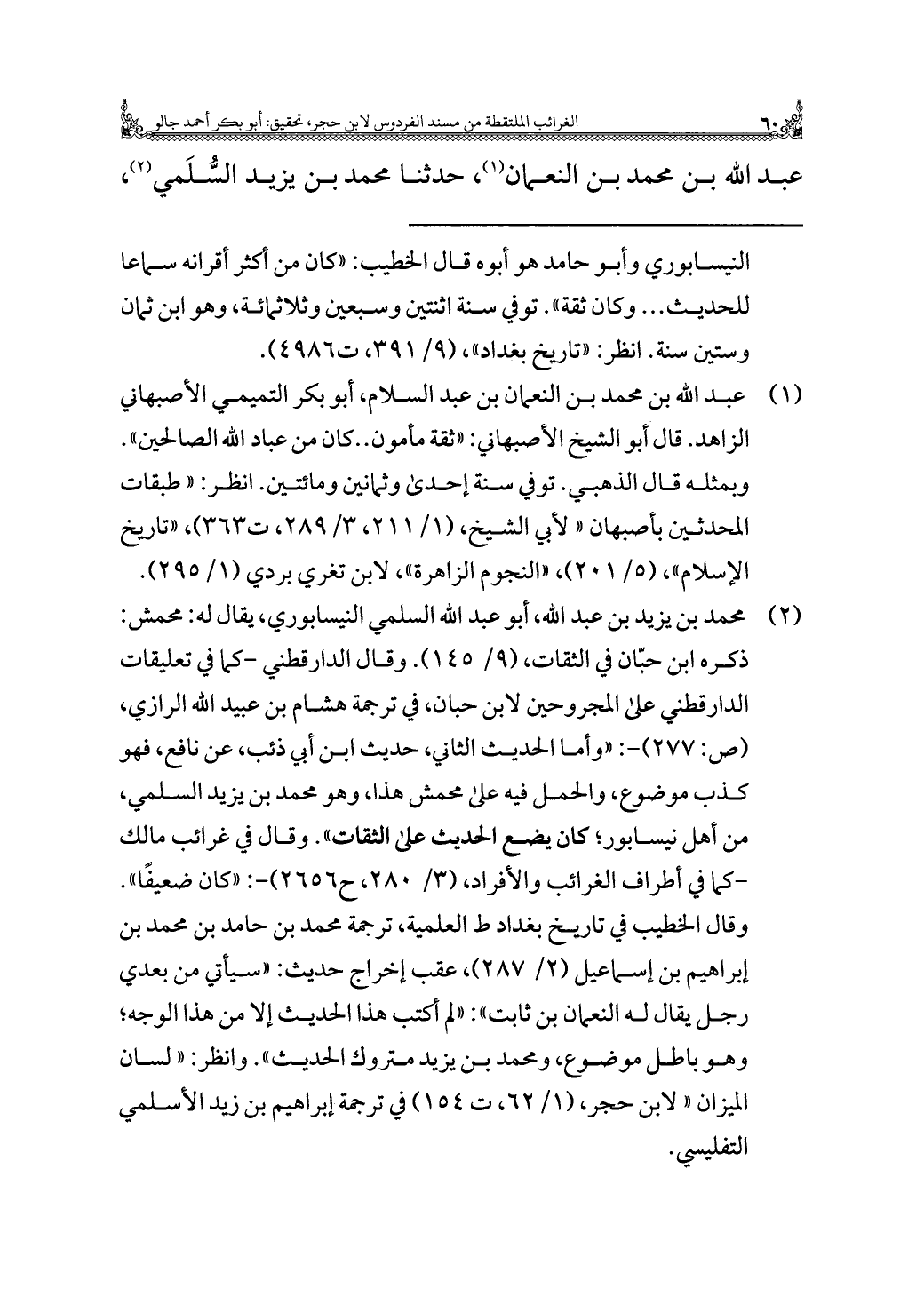 (¬٢) محمد بن يزيد بن عبد اللَّه، أبو عبد اللَّه السلمي النيسابوري، يقال له: محمش: ذكره ابن حبّان في الثقات، (٩/ ١٤٥). وقال الدارقطني - كما في تعليقات الدارقطني على المجروحين لابن حبان، في ترجمة هشام بن عبيد اللَّه الرازي، (ص: ٢٧٧) -: "وأما الحديث الثاني، حديث ابن أبي ذئب، عن نافع، فهو كذب موضوع، والحمل فيه على محمش هذا، وهو محمد بن يزيد السلمي، من أهل نيسابور؛ كان يضع الحديث على الثقات". وقال في غرائب مالك -كما في أطراف الغرائب والأفراد، (٣/ ٢٨٠، ح ٢٦٥٦) -: "كان ضعيفًا". وقال الخطيب في تاريخ بغداد ط العلمية، ترجمة محمد بن حامد بن محمد بن إبراهيم بن إسماعيل (٢/ ٢٨٧)، عقب إخراج حديث: "سيأتي من بعدي رجل يقال له النعمان بن ثابت": "لم أكتب هذا الحديث إلا من هذا الوجه؛ وهو باطل موضوع، ومحمد بن يزيد متروك الحديث". وانظر: "لسان الميزان" لابن حجر، (١/ ٦٢، ت ١٥٤) في ترجمة إبراهيم بن زيد الأسلمي التفليسي.