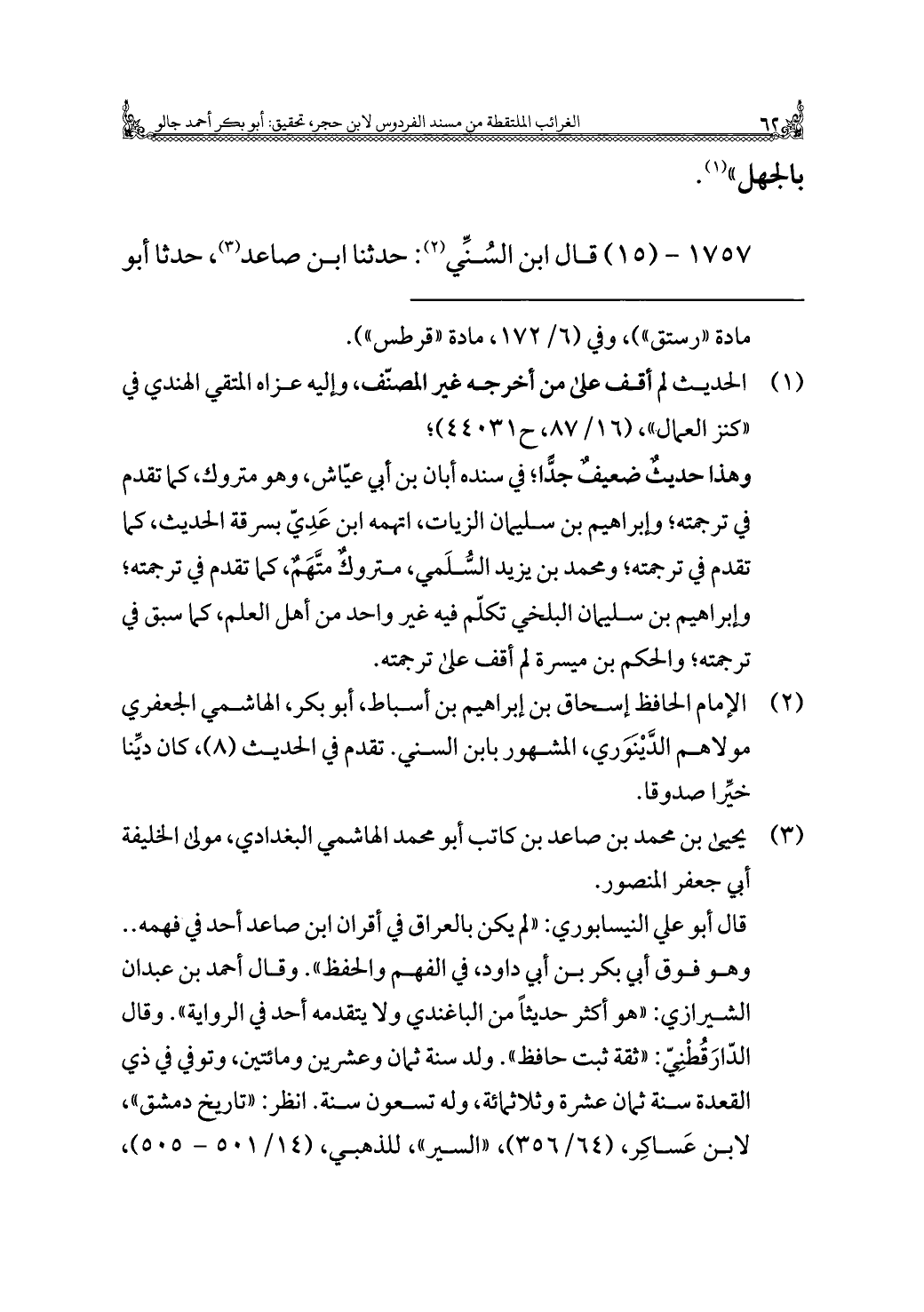 (¬٢) الإِمام الحافظ إسحاق بن إبراهيم بن أسباط، أبو بكر، الهاشمي الجعفري مولاهم الدَّيْنَوَري، المشهور بابن السني. تقدم في الحديث (٨)، كان ديِّنا خيِّرًا صدوقًا.