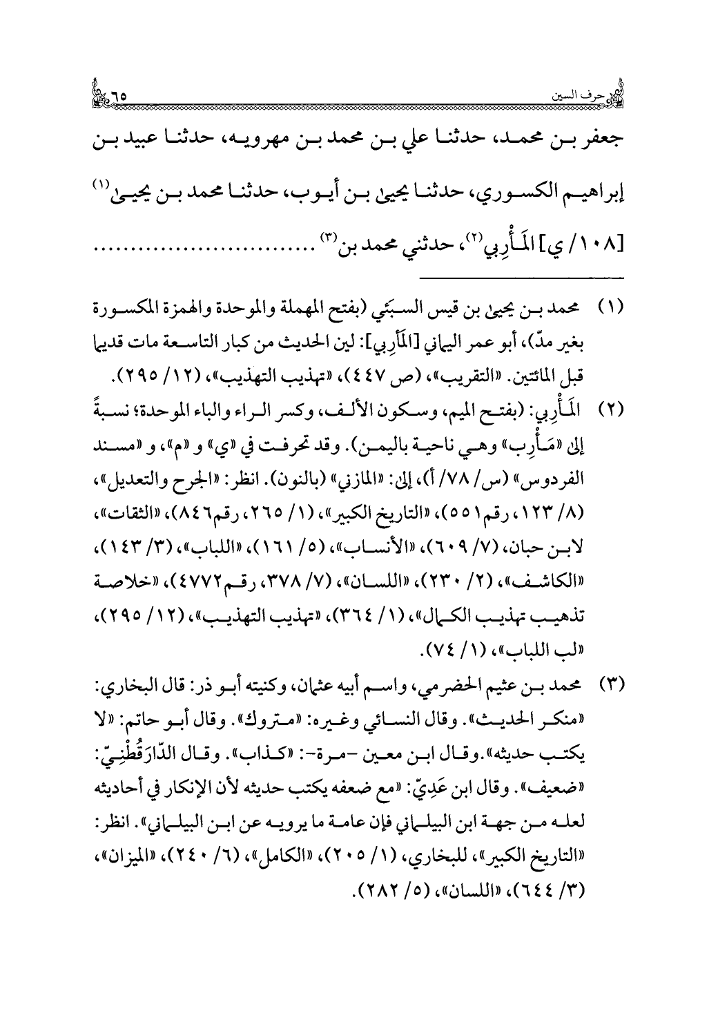 (¬٢) المَأْرِبي: (بفتح الميم، وسكون الألف، وكسر الراء والباء الموحّدة؛ نسبةً إلى "مَأْرِب" وهي ناحية باليمن). وقد تحرفت في "ي" و"م"، و"مسند الفردوس" (س/ ٧٨/ أ)، إلى: "المازني" (بالنون). انظر: "الجرح والتعديل"، (٨/ ١٢٣، رقم ٥٥١)، "التاريخ الكبير"، (١/ ٢٦٥، رقم ٨٤٦)، "الثقات"، لابن حبان" (٧/ ٦٠٩)، "الأنساب"، (٥/ ١٦١)، "اللباب"، (٣/ ١٤٣)، "الكاشف"، (٢/ ٢٣٠)، "اللسان"، (٧/ ٣٧٨، رقم ٤٧٧٢)، "خلاصة تذهيب تهذيب الكمال"، (١/ ٣٦٤)، "تهذيب التهذيب"، (١٢/ ٢٩٥)، "لب اللباب"، (١/ ٧٤).