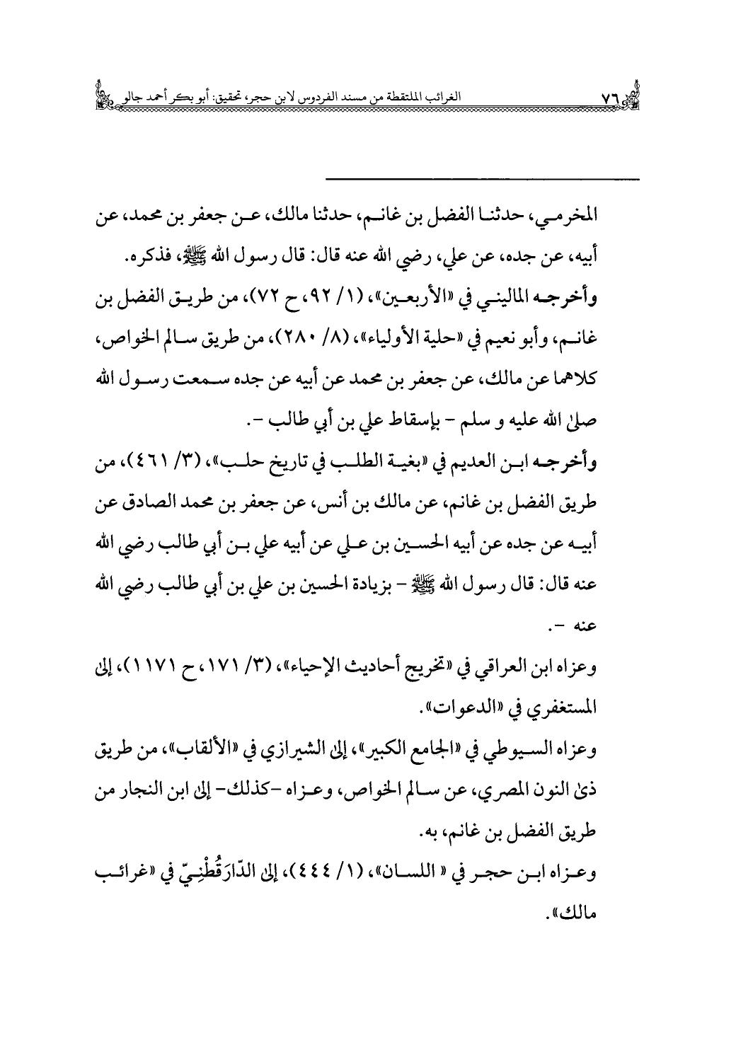 = المخرمي، حدثنا الفضل بن غانم، حدثنا مالك، عن جعفر بن محمد، عن أبيه، عن جده، عن علي، رضي اللَّه عنه قال: قال رسول اللَّه -صلى اللَّه عليه وسلم-، فذكره.