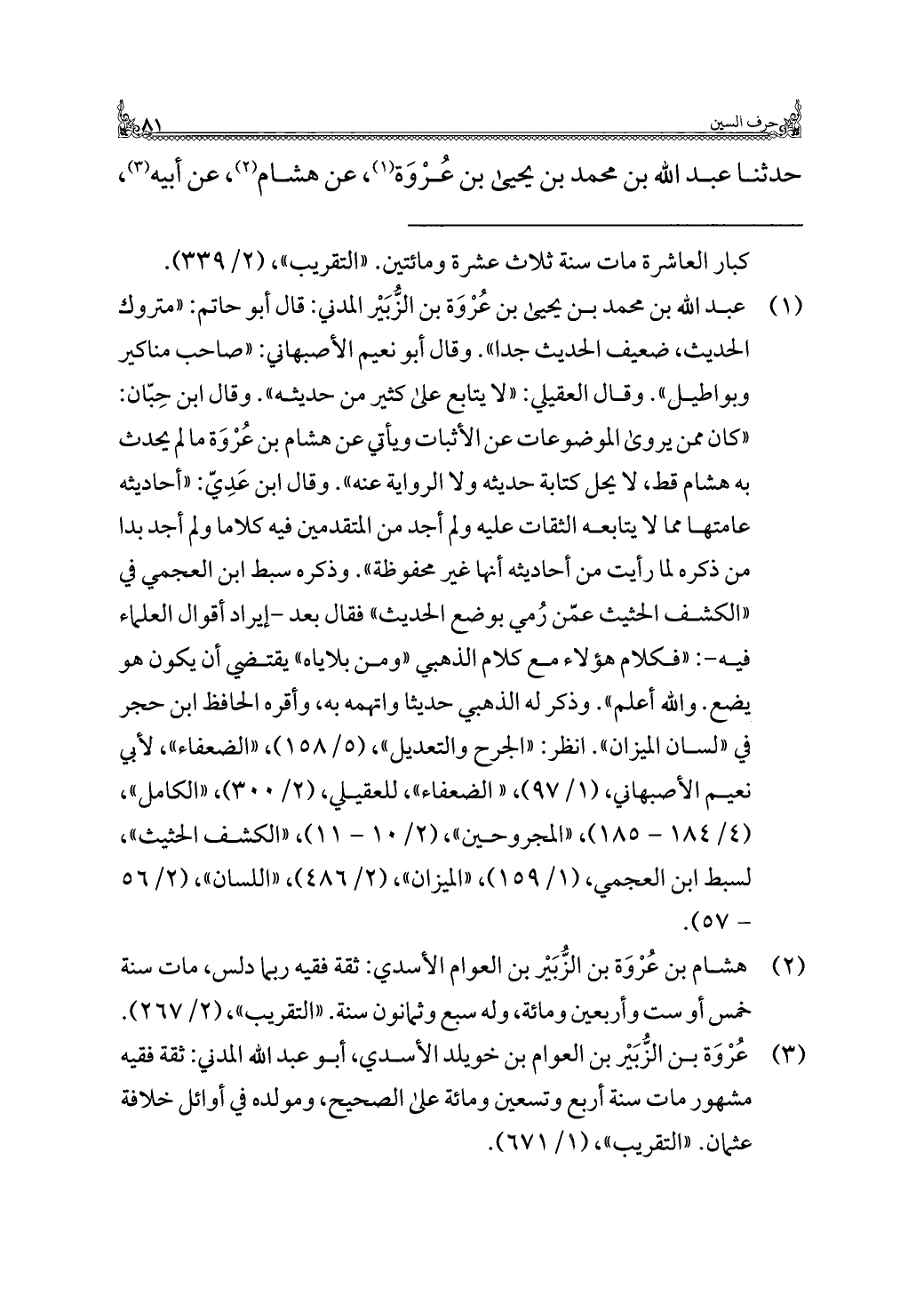(¬٢) هشام بن عُرْوَة بن الزُّبَيْر بن العوام الأسدي: ثقة فقيه ربما دلس، مات سنة خمس أو ست وأربعين ومائة، وله سبع وثمانون سنة. "التقريب"، (٢/ ٢٦٧).