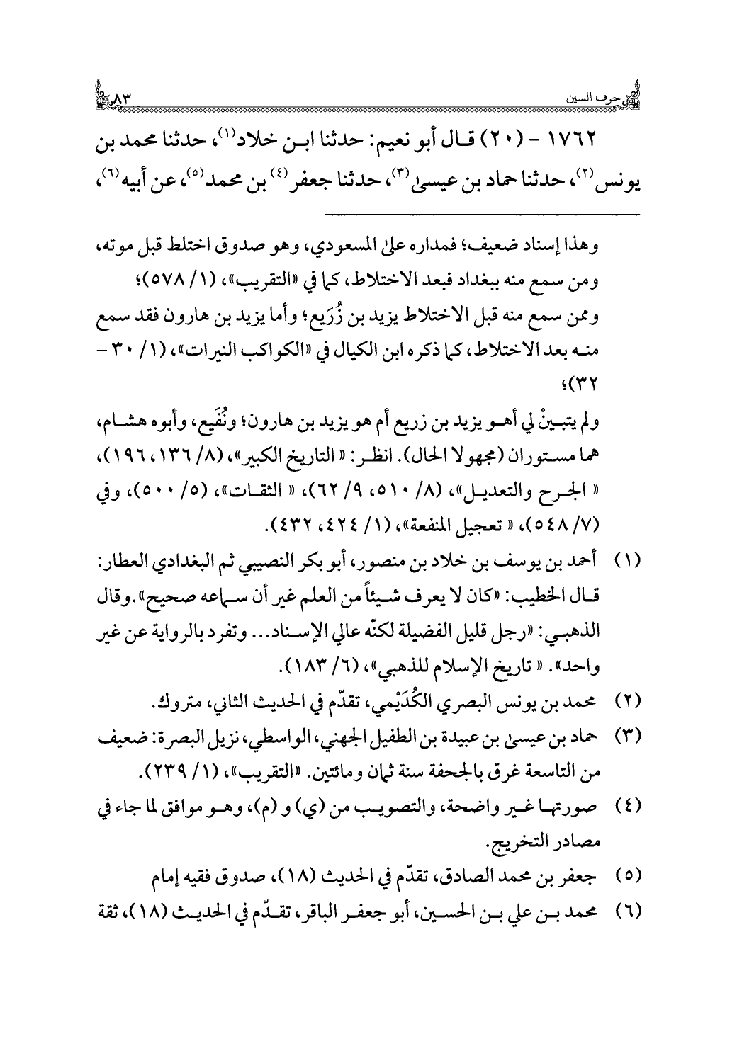 ١٧٦٢ - (٢٠) قال أبو نعيم: حدثنا ابن خلاد (¬١)، حدثنا محمد بن يونس (¬٢)، حدثنا حماد بن عيسى (¬٣)، حدثنا جعفر (¬٤) بن محمد (¬٥)، عن أبيه (¬٦)،