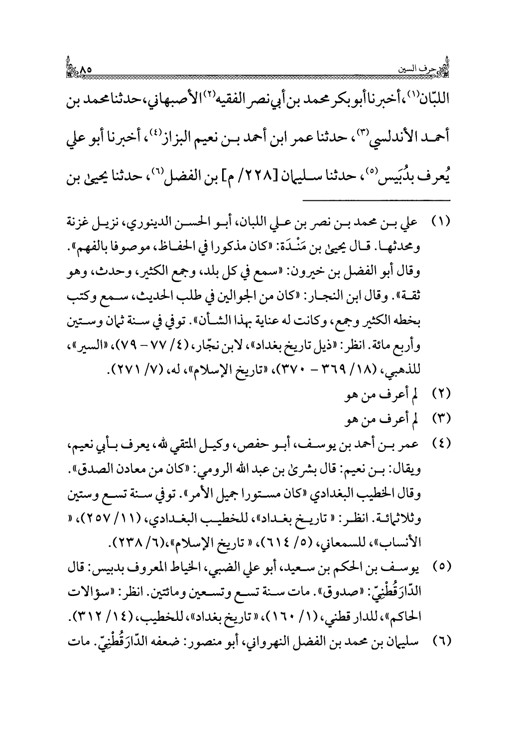 اللبّان (¬١)، أخبرنا أبو بكر محمد بن أبي نصر الفقيه (¬٢) الأصبهاني، حدثنا محمد بن أحمد الأندلسي (¬٣)، حدثنا عمر ابن أحمد بن نعيم البزاز (¬٤)، أخبرنا أبو علي يُعرف بدُبَيس (¬٥)، حدثنا سليمان بن الفضل (¬٦)، حدثنا يحيى بن