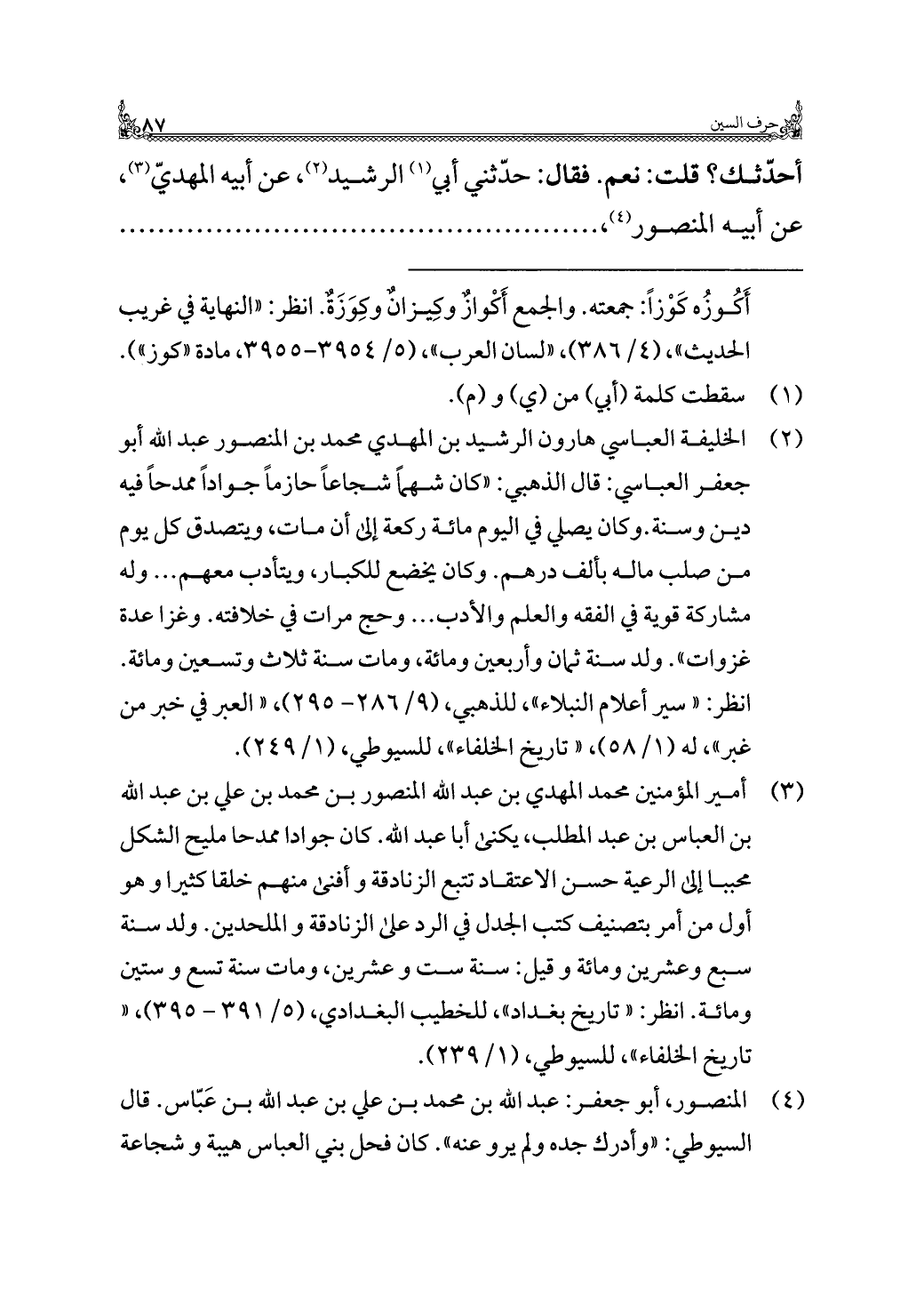 أحدّثك؟ قلت: نعم. فقال: حدّثني أبي (¬١) الرشيد (¬٢)، عن أبيه المهديّ (¬٣)، عن أبيه المنصور (¬٤)، . . . . . .