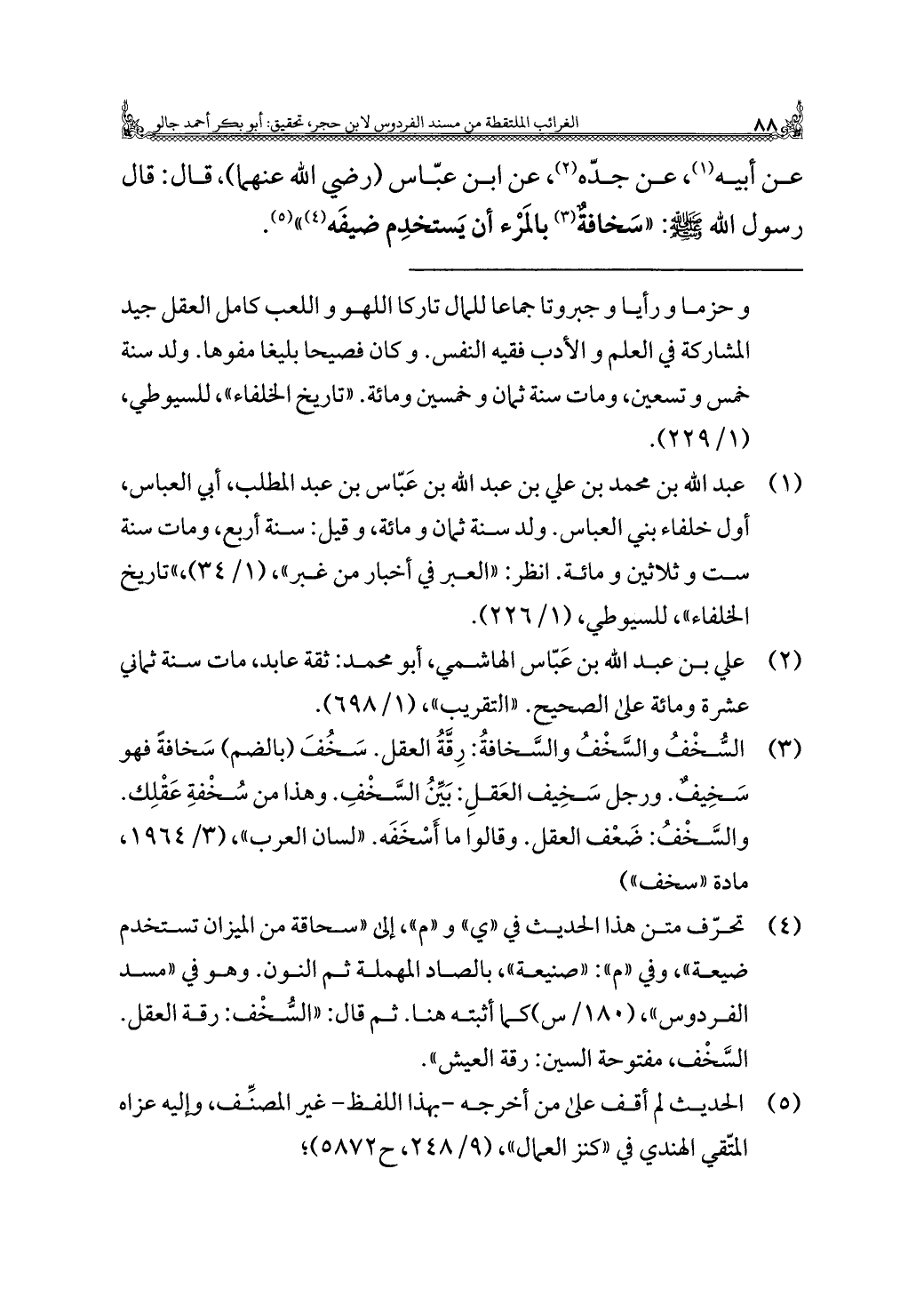 (¬٤) تحرّف متن هذا الحديث في "ي" و"م"، إلى "سحاقة من الميزان تستخدم ضيعة"، وفي "م": "صنيعة"، بالصاد المهملة ثم النون. وهو في "مسند الفردوس"، (١٨٠/ س) كما أثبته هنا. ثم قال: "السُّخْف: رقة العقل. السَّخْف، مفتوحة السين: رقة العيش".