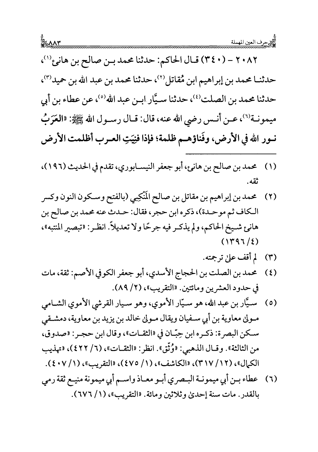 ٢٠٨٢ - (٣٤٠) قال الحاكم: حدثنا محمد بن صالح بن هانئ (¬١)، حدثنا محمد بن إبراهيم ابن مُقاتل (¬٢)، حدثنا محمد بن عبد اللَّه بن حميد (¬٣)، حدثنا محمد بن الصلت (¬٤)، حدثنا سيَّار ابن عبد اللَّه (¬٥)، عن عطاء بن أبي ميمونة (¬٦)، عن أنس رضي اللَّه عنه، قال: قال رسول اللَّه -صلى اللَّه عليه وسلم-: "العَرَبُ نور اللَّه في الأرض، وفَناؤهم ظلمة؛ فإذا فنِيَتِ العرب أظلمت الأرض