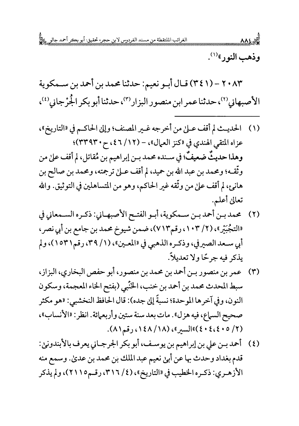 ٢٠٨٣ - (٣٤١) قال أبو نعيم: حدثنا محمد بن أحمد بن سمكوية الأصبهاني (¬٢)، حدثنا عمر ابن منصور البزار (¬٣)، حدثنا أبو بكر الجُرْجاني (¬٤)،