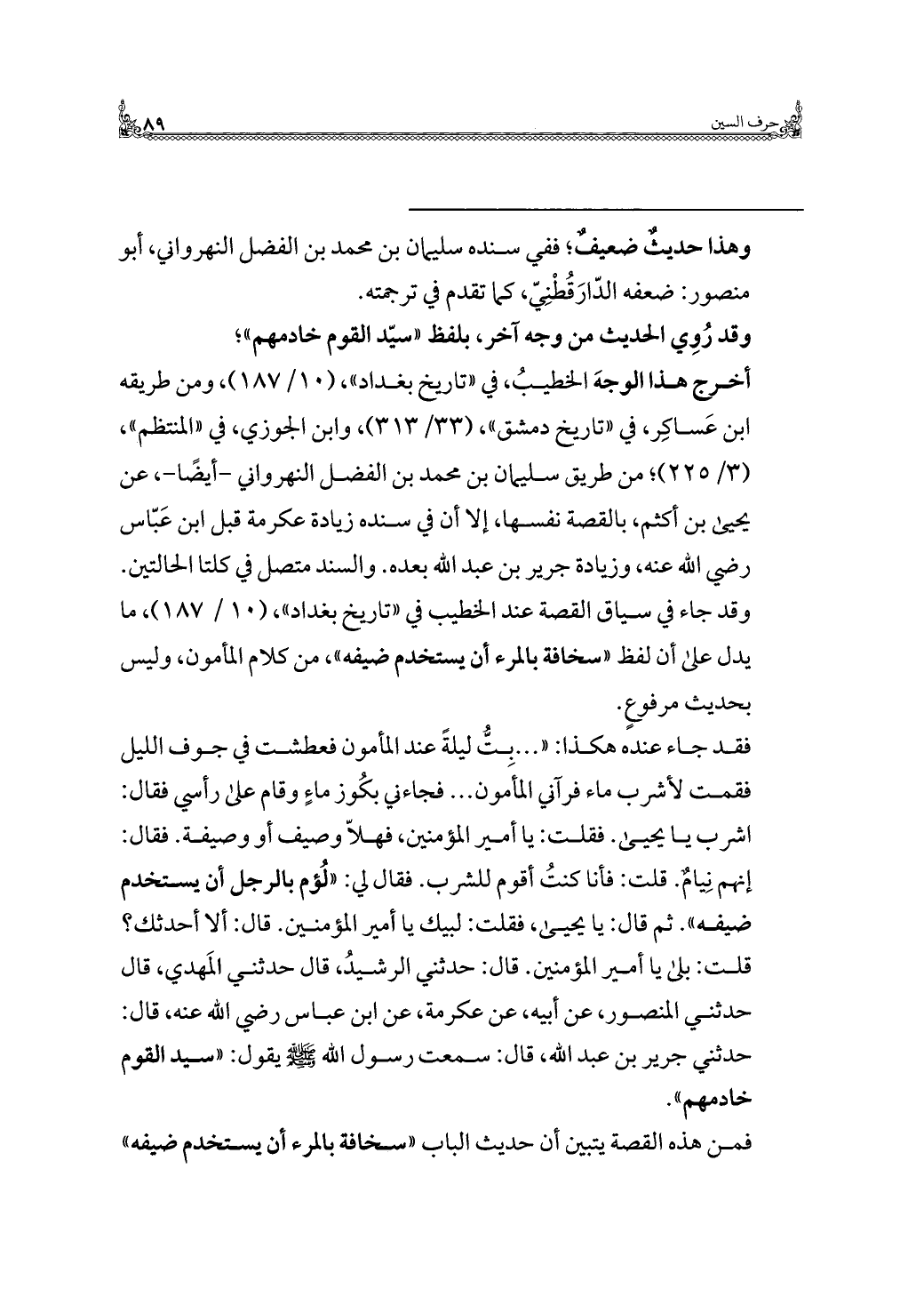 أخرج هذا الوجهَ الخطيبُ، في "تاريخ بغداد"، (١٠/ ١٨٧)، ومن طريقه ابن عَساكِر، في "تاريخ دمشق"، (٣٣/ ٣١٣)، وابن الجوزي، في "المنتظم"، (٣/ ٢٢٥)؛ من طريق سليمان بن محمد بن الفضل النهرواني -أيضًا-، عن يحيى بن أكثم، بالقصة نفسها، إلا أن في سنده زيادة عكرمة قبل ابن عَبّاس رضي اللَّه عنه، وزيادة جرير بن عبد اللَّه بعده. والسند متصل في كلتا الحالتين. وقد جاء في سياق القصة عند الخطيب في "تاريخ بغداد"، (١٠/ ١٨٧)، ما يدل على أن لفظ "سخافة بالمرء أن يستخدم ضيفه"، من كلام المأمون، وليس بحديث مرفوع.