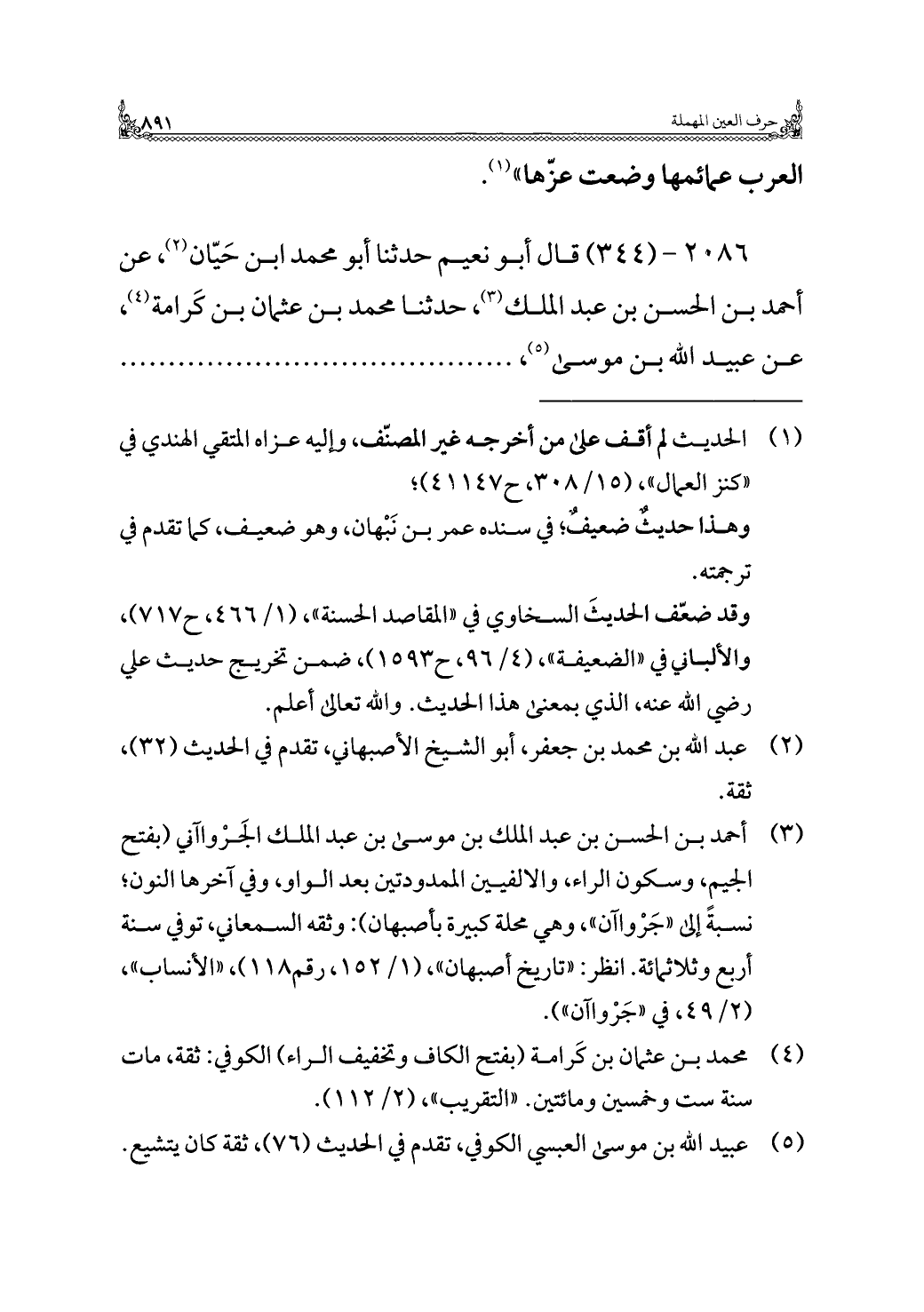 ٢٠٨٦ - (٣٤٤) قال أبو نعيم حدثنا أبو محمد ابن حَيّان (¬٢)، عن أحمد بن الحسن بن عبد الملك (¬٣)، حدثنا محمد بن عثمان بن كَرامة (¬٤)، عن عبيد اللَّه بن موسى (¬٥)، . . . . . .