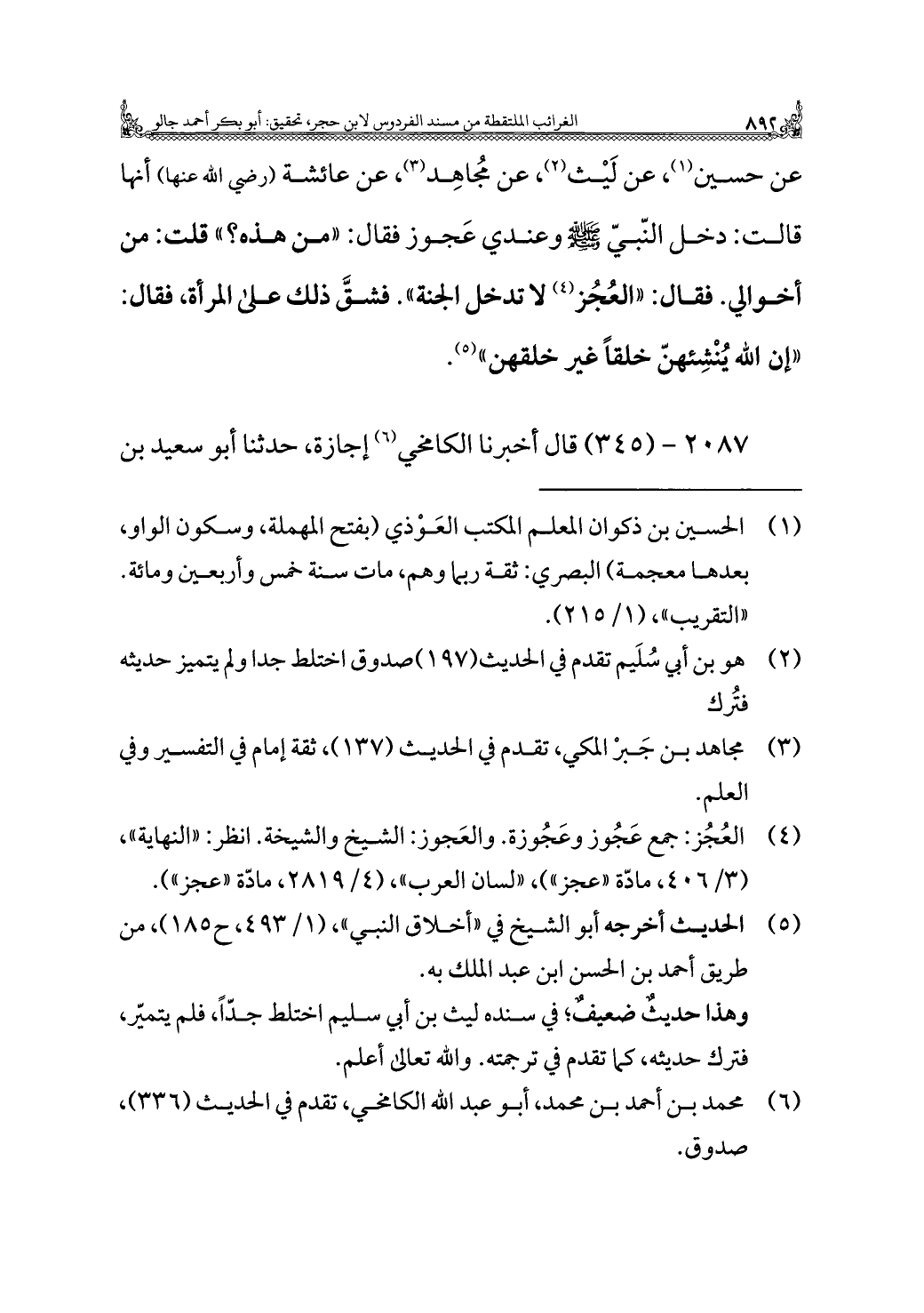 عن حسين (¬١)، عن لَيْث (¬٢)، عن مُجاهِد (¬٣)، عن عائشة (رضي اللَّه عنها) أنها قالت: دخل النّبيّ -صلى اللَّه عليه وسلم- وعندي عَجوز فقال: "من هذه؟ " قلت: من أخوالي. فقال: "العُجُز (¬٤) لا تدخل الجنة". فشقَّ ذلك على المرأة، فقال: "إن اللَّه يُنْشِئهنّ خلقًا غير خلقهن" (¬٥).
