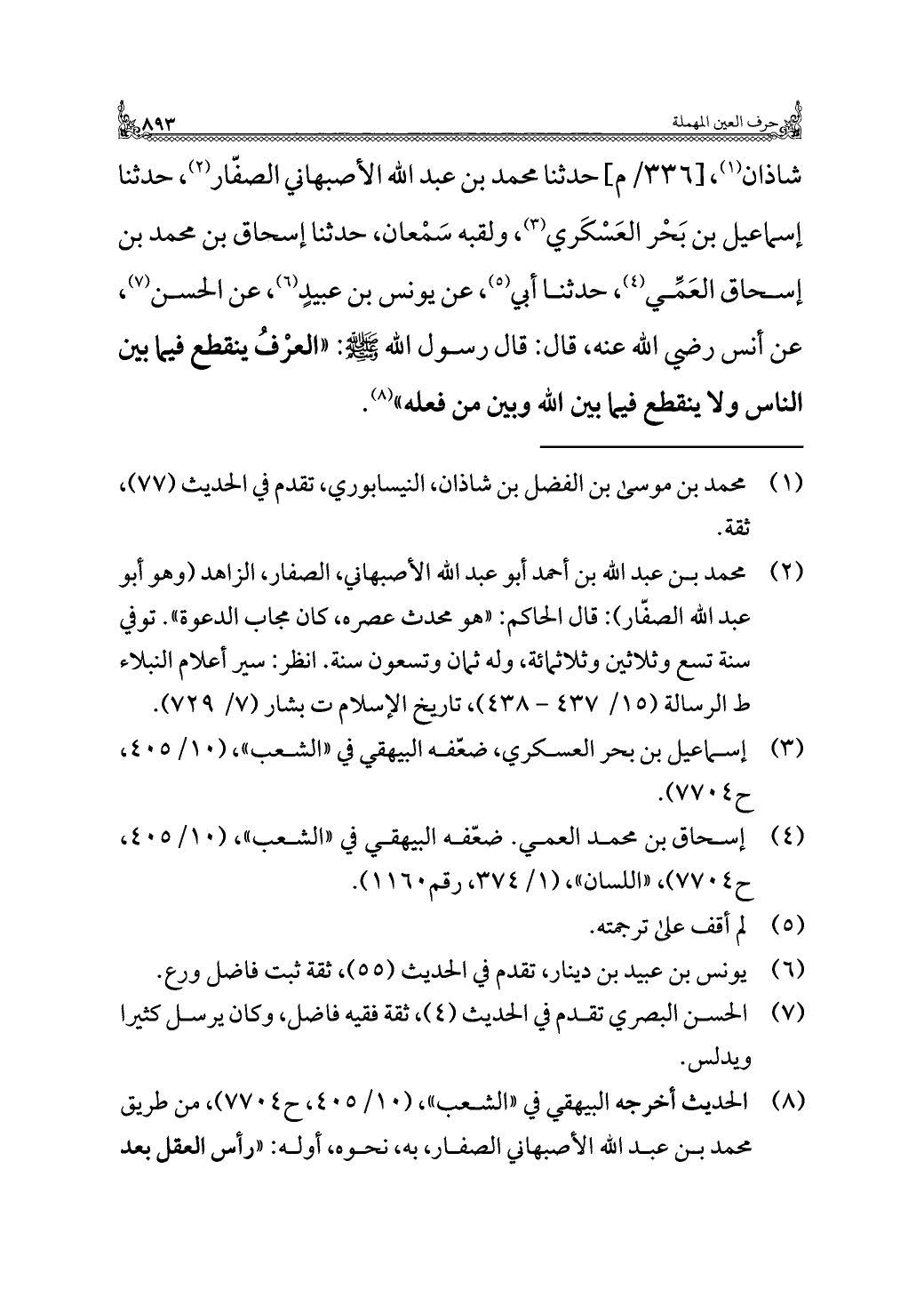 شاذان (¬١)، حدثنا محمد بن عبد اللَّه الأصبهاني الصفّار (¬٢)، حدثنا إسماعيل بن بَحْر العَسْكَري (¬٣)، ولقبه سَمْعان، حدثنا إسحاق بن محمد بن إسحاق العَمِّي (¬٤)، حدثنا أبي (¬٥)، عن يونس بن عبيدٍ (¬٦)، عن الحسن (¬٧)، عن أنس رضي اللَّه عنه، قال: قال رسول اللَّه -صلى اللَّه عليه وسلم-: "العرْفُ ينقطع فيما بين الناس ولا ينقطع فيما بين اللَّه وبين من فعله" (¬٨).
