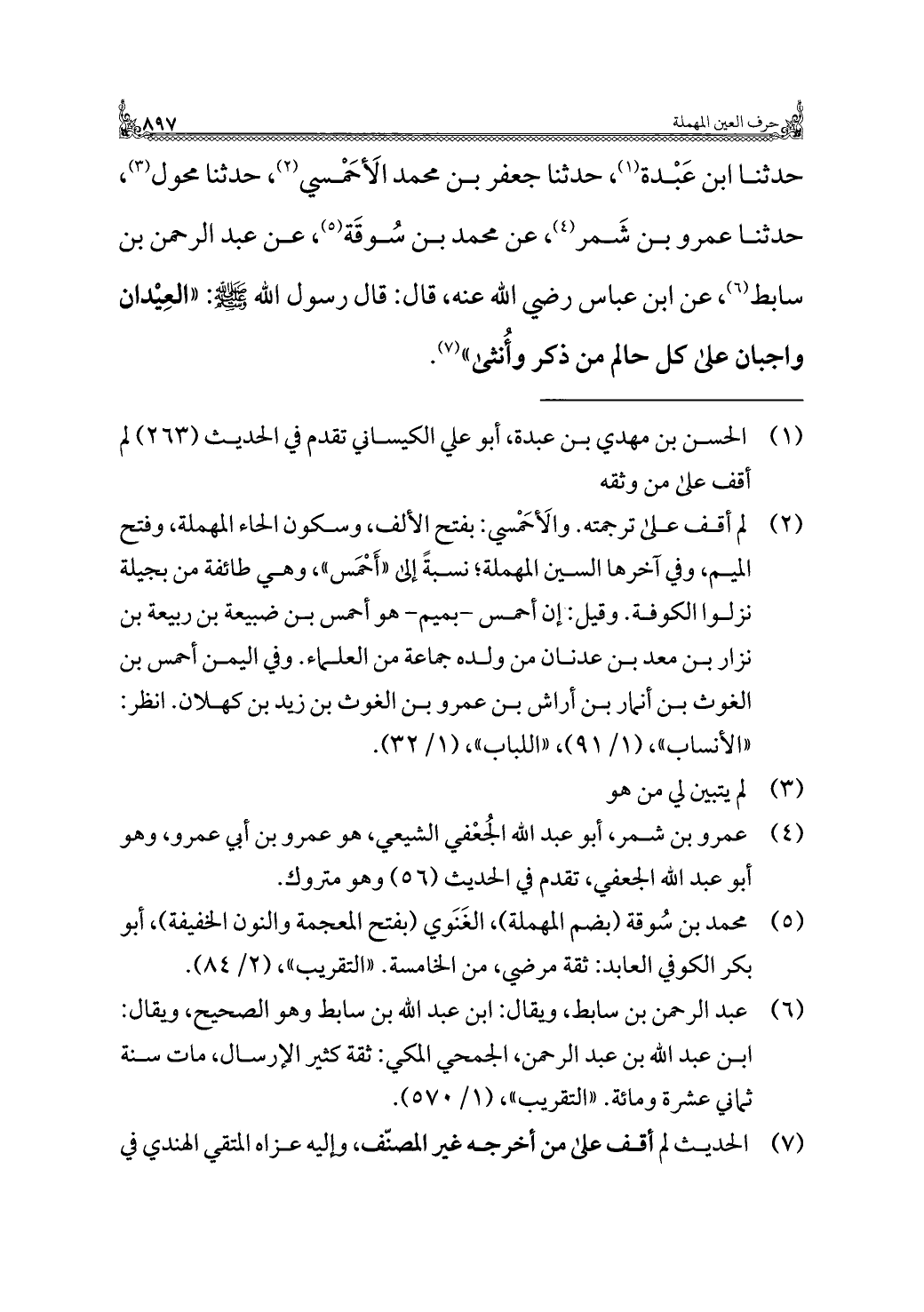 حدثنا ابن عَبْدة (¬١)، حدثنا جعفر بن محمد الأَحْمَسي (¬٢)، حدثنا محول (¬٣)، حدثنا عمرو بن شَمر (¬٤)، عن محمد بن سُوقَة (¬٥)، عن عبد الرحمن بن سابط (¬٦)، عن ابن عباس رضي اللَّه عنه، قال: قال رسول اللَّه -صلى اللَّه عليه وسلم-: "العِيْدان واجبان على كل حالم من ذكر وأُنثى" (¬٧).