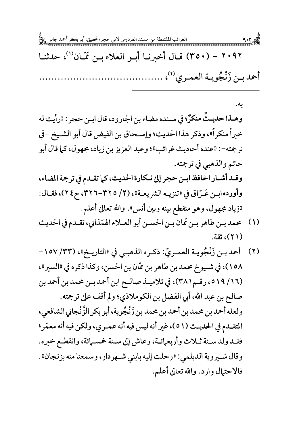 (¬٢) أحمد بن زَنْجُوية العمريّ: ذكره الذهبي في "التاريخ"، (٣٣/ ١٥٧ - ١٥٨)، في شيوخ محمد بن طاهر بن ممّان بن الحسن، وكذا ذكره في "السير"، (١٦/ ٥١٩، رقم ٣٨١)، في تلاميذ صالح ابن أحمد بن محمد بن أحمد بن صالح بن عبد الله، أبي الفضل بن الكوملاذي؛ ولم أقف على ترجمته.