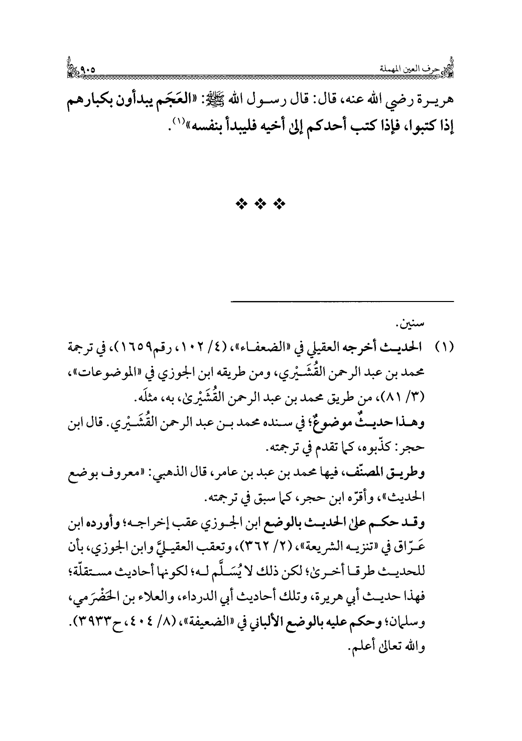 هريرة رَضِيَ اللَّهُ عَنْهُ، قال: قال رسول الله -صَلَّى اللهُ عَلَيْهِ وَسَلَّمَ-: "العَجَم يبدأون بكبارهم إِذَا كتبوا، فإذا كتب أحدكم إلى أخيه فليبدأ بنفسه" (¬١).