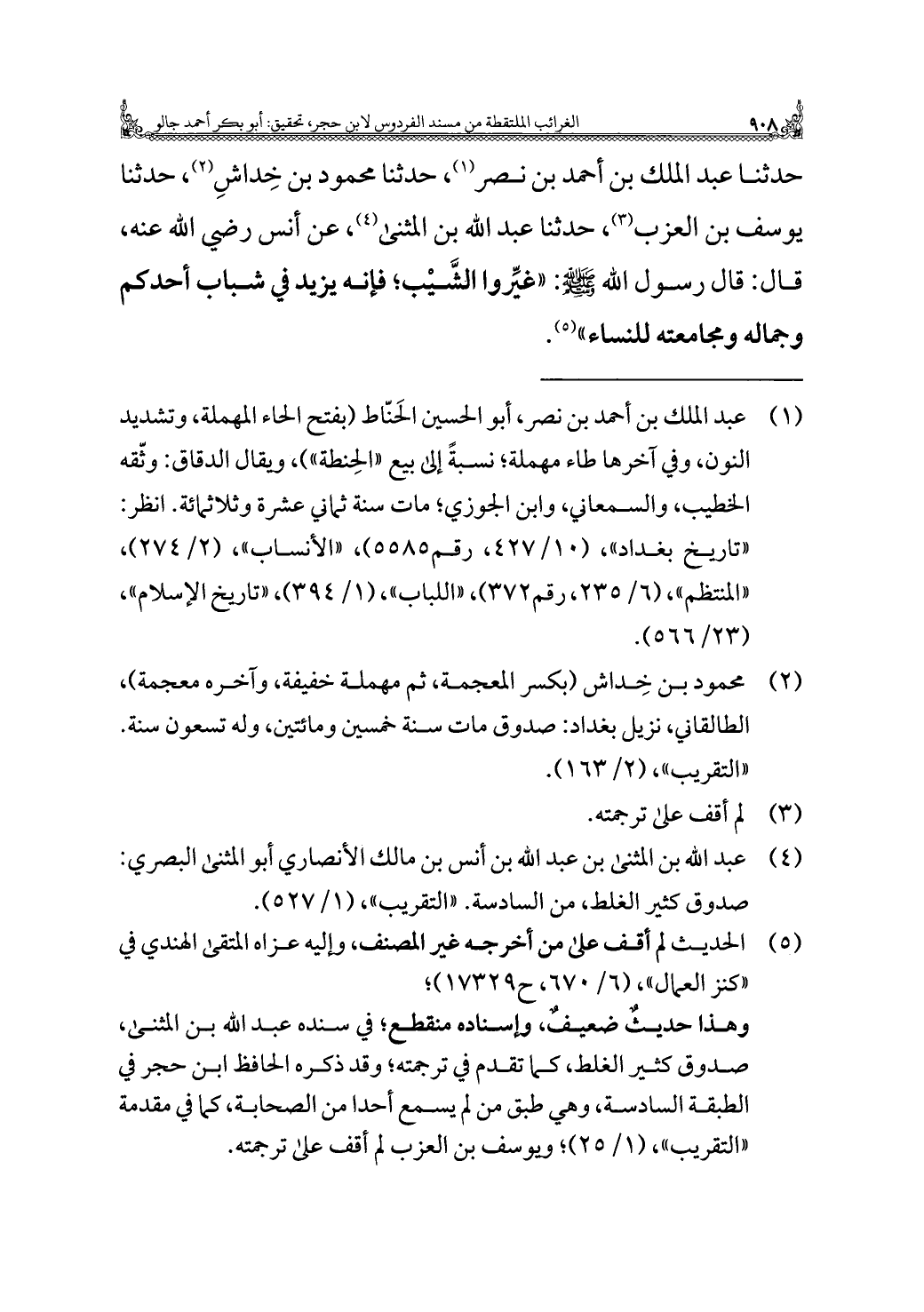 حدثنا عبد الملك بن أحمد بن نصر (¬١)، حدثنا محمود بن خِداشِ (¬٢)، حدثنا يوسف بن العزب (¬٣)، حدثنا عبد الله بن المثنى (¬٤)، عن أنس رَضِيَ اللَّهُ عَنْهُ، قال: قال رسول الله -صَلَّى اللهُ عَلَيْهِ وَسَلَّمَ-: "غيِّروا الشَّيْب؛ فإنه يزيد في شباب أحدكم وجماله ومجامعته للنساء" (¬٥).