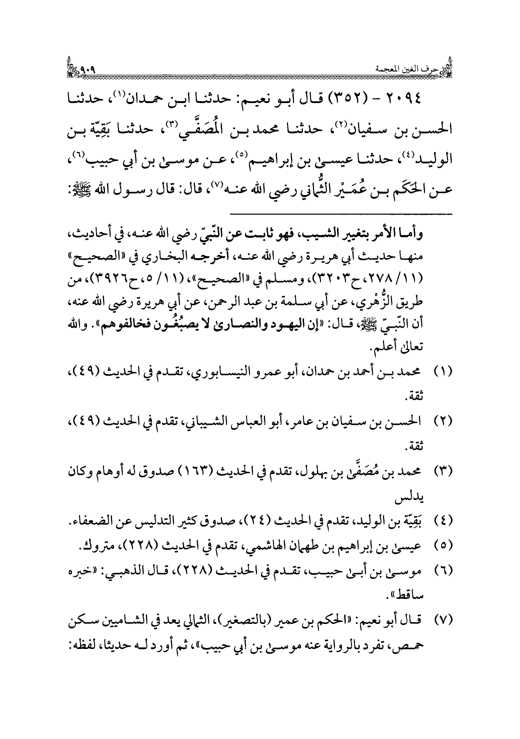 وأمَّا الأمر بتغيير الشيب، فهو ثابت عن النّبيّ -صلى الله عليه وسلم-، في أحاديث، منها حديث أبي هريرة رَضِيَ اللَّهُ عَنْهُ، أخرجه البخاري في "الصحيح" (١١/ ٢٧٨، ح ٣٢٠٣)، ومسلم في "الصحيح"، (١١/ ٥، ح ٣٩٢٦)، من طريق الزُّهْري، عن أبي سلمة بن عبد الرَّحمن، عن أبي هريرة رَضِيَ اللَّهُ عَنْهُ، أن النّبيّ -صَلَّى اللهُ عَلَيْهِ وَسَلَّمَ-، قال: "إن اليهود والنصارى لا يصبُغُون فخالفوهم". والله تعالى أعلم.
