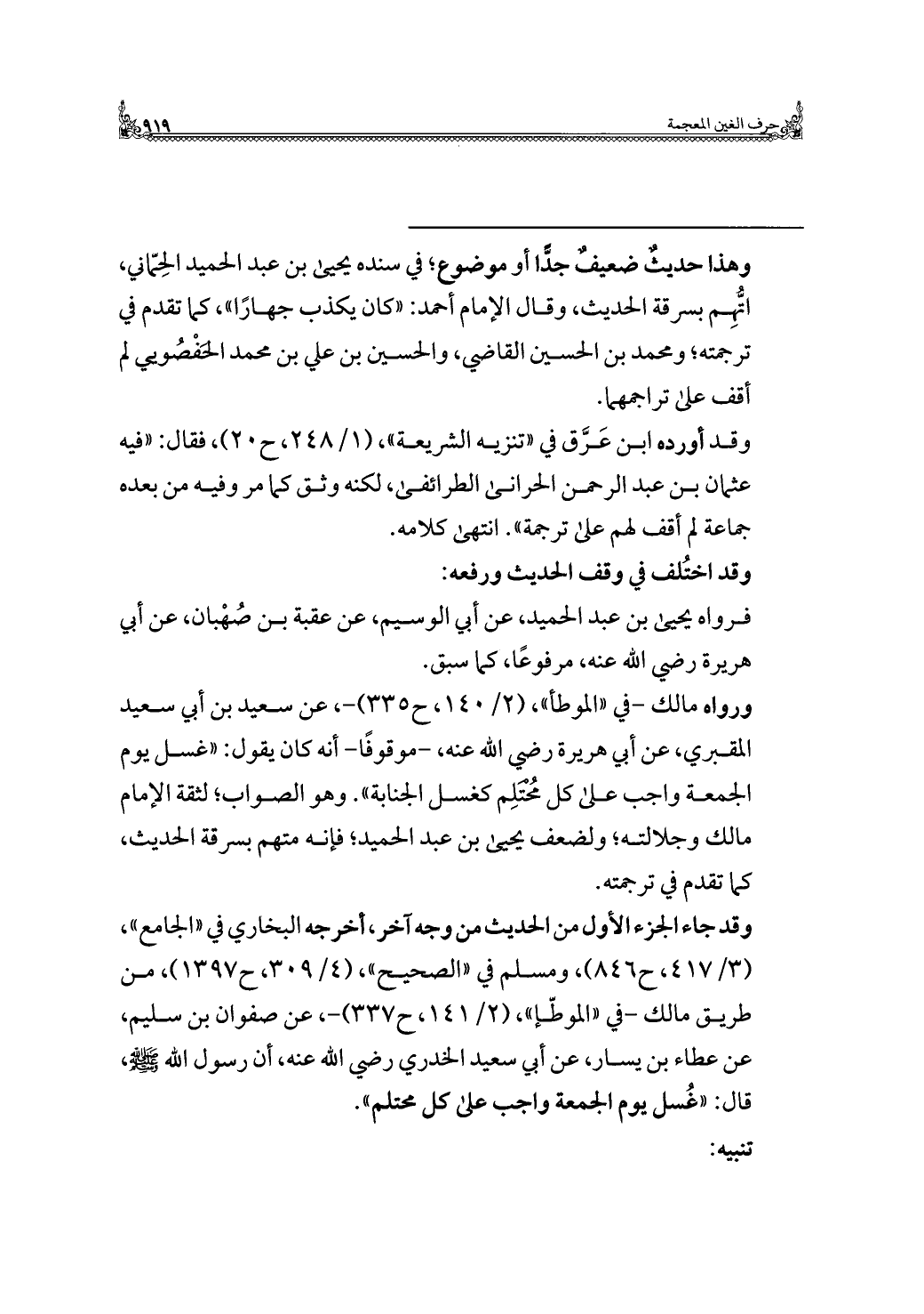 ورواه مالك -في "الموطأ"، (٢/ ١٤٠، ح ٣٣٥) -، عن سعيد بن أبي سعيد المقبري، عن أبي هريرة رَضِيَ اللَّهُ عَنْهُ، -موقوفًا- أنه كان يقول: "غسل يوم الجمعة واجب على كلّ مُحُتلِم كغسل الجنابة". وهو الصواب؛ لثقة الإِمام مالك وجلالته؛ ولضعف يحيى بن عبد الحميد؛ فإنه متهم بسرقة الحديث، كما تقدم في ترجمته.