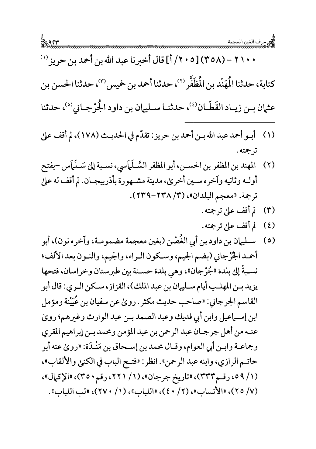 (¬٥) سليمان بن داود بن أبي الغُصْن (بغين معجمة مضمومة، وآخره نون)، أبو أحمد الجُرْجاني "بضم الجيم، وسكون الراء، والجيم، والنون بعد الألف؛ نسبةً إلى بلدة "جُرْجان"، وهي بلدة حسنة بين طبرستان وخراسان، فتحها يزيد بن المهلّب أيام سليمان بن عبد الملك)، القزاز، سكن الري: قال أبو القاسم الجرجاني: "صاحب حديث مكثر. روى عن سفيان بن عُيَيْنة ومؤمل ابن إسماعيل وابن أبي فديك وعبد الصمد بن عبد الوارث وغيرهم؛ روى عنه من أهل جرجان عبد الرَّحمن بن عبد المؤمن ومحمد بن إبراهيم المقري وجماعة وابن أبي العوام، وقال محمد بن إسحاق بن مَنْدَة: "روى عنه أبو حاتم الرازي، وابنه عبد الرَّحمن". انظر: "فتح الباب في الكنى والألقاب"، (١/ ٥٩، رقم ٣٣٣)، "تاريخ جرجان"، (١/ ٢٢١، رقم ٣٥٠)، "الإكمال"، (٧/ ٢٥)، "الأنساب"، (٢/ ٤٠)، "اللباب"، (١/ ٢٧٠)، "لب اللباب".