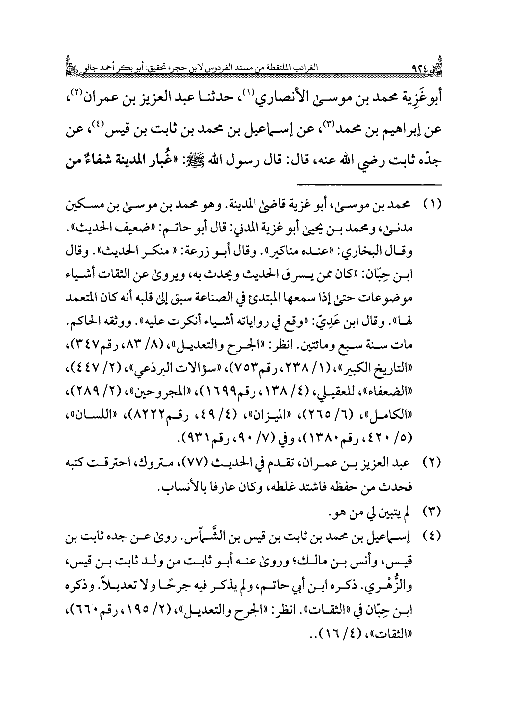 أبو غَزِية محمد بن موسى الأنصاري (¬١)، حدثنا عبد العزيز بن عمران (¬٢)، عن إبراهيم بن محمد (¬٣)، عن إسماعيل بن محمد بن ثابت بن قيس (¬٤)، عن جدّه ثابت رَضِيَ اللَّهُ عَنْهُ، قال: قال رسول الله -صَلَّى اللهُ عَلَيْهِ وَسَلَّمَ-: "غُبار المدينة شفاءٌ من