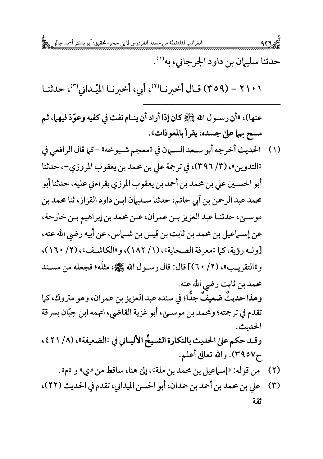 (¬١) الحديث أخرجه أبو سعد السمان في "معجم شيوخه" -كما قال الرافعي في "التدوين"، (٣/ ٣٩٦)، في ترجمة علي بن محمد بن يعقوب المروزي-، حدثنا أبو الحسين علي بن محمد بن أحمد بن يعقوب المرزي بقراءتي عليه، حدثنا أبو محمد عبد الرَّحمن بن أبي حاتم، حدثنا سليمان ابن داود القزاز، ثنا محمد بن مُوسى، حدثنا عبد العزيز بن عمران، عن محمد بن إبراهيم بن خارجة، عن إسماعيل بن محمد بن ثابت بن قيس بن شماس، عن أبيه رَضِيَ اللَّهُ عَنْهُ، [وله رؤية، كما "معرفة الصحابة"، (١/ ١٨٢)، و"الكاشف"، (٢/ ١٦٠)، و"التقريب"، (٢/ ٦٠)] قال: قال رسول الله -صَلَّى اللهُ عَلَيْهِ وَسَلَّمَ-، مثلَه؛ فجعله من مسند محمد بن ثابت رَضِيَ اللَّهُ عَنْهُ.