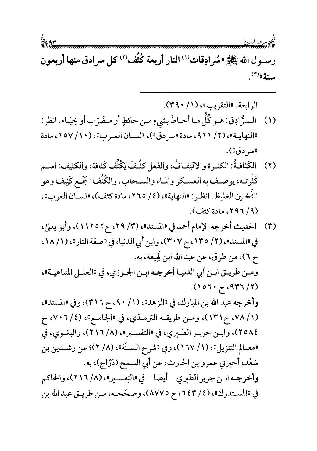 رسول اللَّه -صلى اللَّه عليه وسلم- "سُرادِقات (¬١) النار أربعة كُثُف (¬٢) كل سرادق منها أربعون سنة" (¬٣).