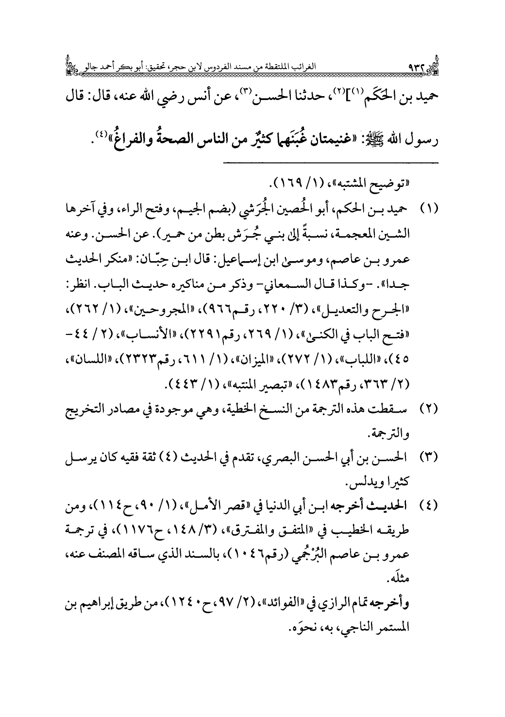 حميد بن الحكَم (¬١)] (¬٢)، حدثنا الحسن (¬٣)، عن أنس رَضِيَ اللَّهُ عَنْهُ، قال: قال رسول الله -صَلَّى اللهُ عَلَيْهِ وَسَلَّمَ-: "غنيمتان غُبَنَهما كثيرٌ من النّاس الصحةُ والفراغُ" (¬٤).