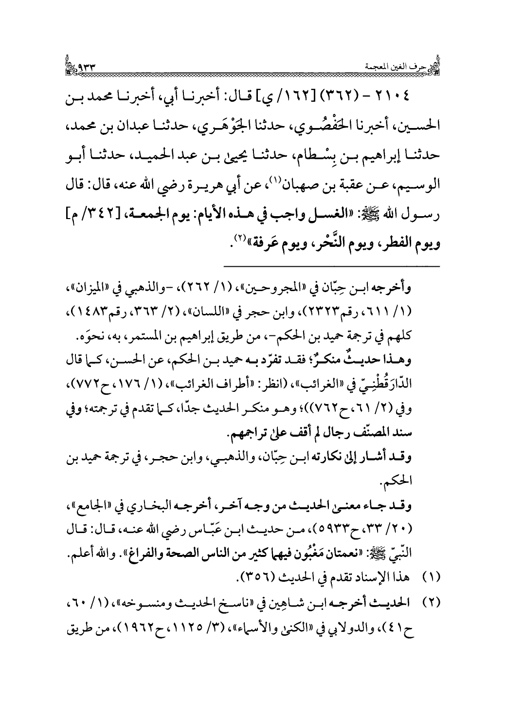 ٢١٠٤ - (٣٦٢) قال: أَخْبَرَنَا أبي، أَخْبَرَنَا محمد بن الحسين، أَخْبَرَنَا الحَفْصُوي، حدثنا الجَوْهَري، حدثنا عبدان بن محمد، حدثنا إبراهيم بن بِسْطام، حدثنا يحيى بن عبد الحميد، حدثنا أبو الوسيم، عن عُقبة بن صهبان (¬١)، عن أبي هريرة رَضِيَ اللَّهُ عَنْهُ، قال: قال رسول الله -صَلَّى اللهُ عَلَيْهِ وَسَلَّمَ-: "الغسل واجب في هذه الأيام: يوم الجمعة، ويوم الفطر، ويوم النَّحْر، ويوم عَرفة" (¬٢).