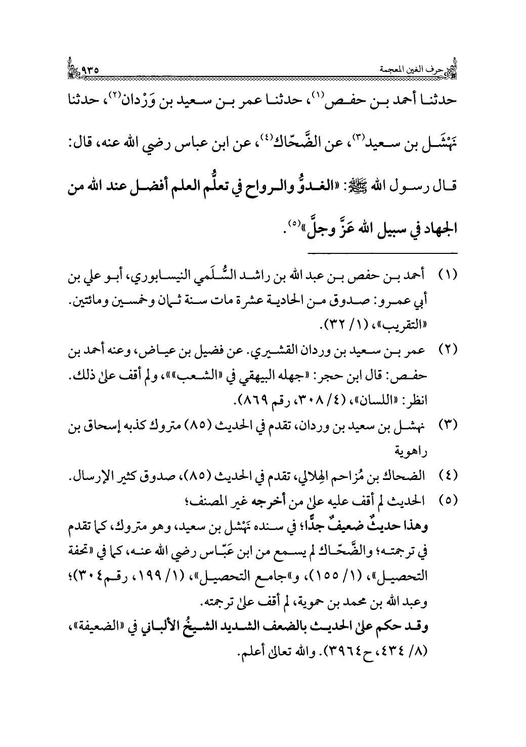 حدثنا أحمد بن حفص (¬١)، حدثنا عمر بن سعيد بن وَرْدان (¬٢)، حدثنا نَهْشَل بن سعيد (¬٣)، عن الضَّحّاك (¬٤)، عن ابن عَبَّاس رَضِيَ اللَّهُ عَنْهُ، قال: قال رسول الله -صَلَّى اللهُ عَلَيْهِ وَسَلَّمَ-: "الغدوُّ والرواح في تعلُّم العلم أفضل عند الله من الجهاد في سبيل الله عَزَّ وجلَّ" (¬٥).