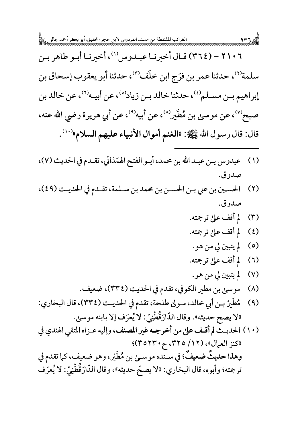 ٢١٠٦ - (٣٦٤) قال أَخْبَرَنَا عبدوس (¬١)، أَخْبَرَنَا أبو طاهر بن سلمة (¬٢)، حدثنا عمر بن فرَج ابن خلَف (¬٣)، حدثنا أبو يعقوب إسحاق بن إبراهيم بن مسلم (¬٤)، حدثنا خالد بن زياد (¬٥)، عن أبيه (¬٦)، عن خالد بن صبح (¬٧)، عن موسى بن مُطَير (¬٨)، عن أبيه (¬٩)، عن أبي هريرة رَضِيَ اللَّهُ عَنْهُ، قال: قال رسول الله -صَلَّى اللهُ عَلَيْهِ وَسَلَّمَ-: "الغنم أموال الأنبياء عليهم السلام" (¬١٠).
