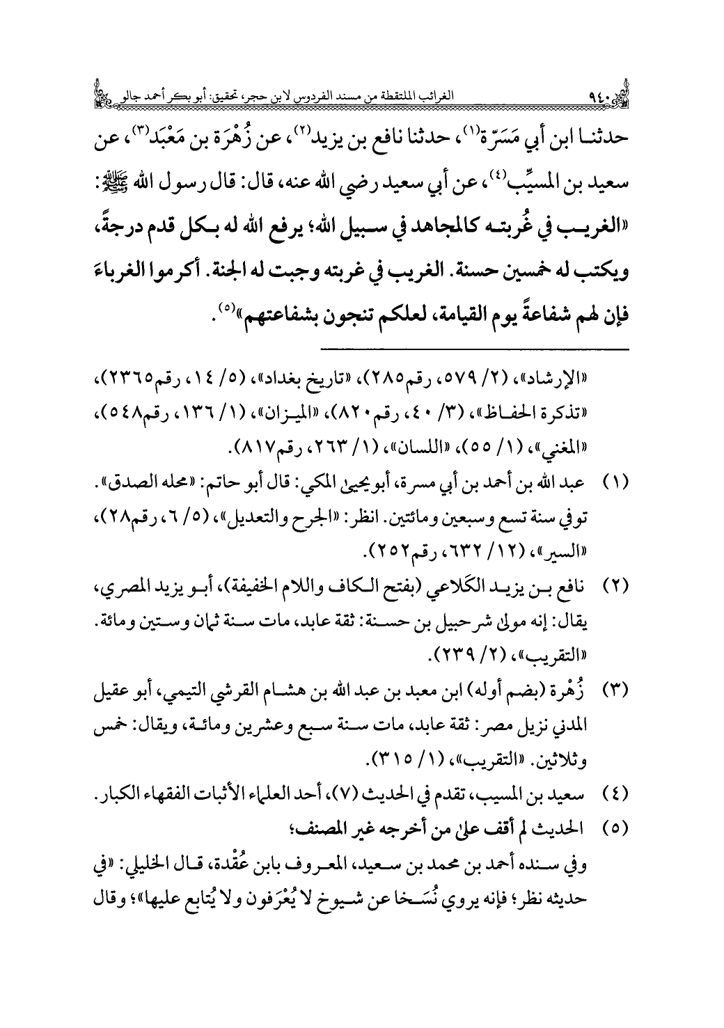 حدثنا ابن أبي مَسَرّة (¬١)، حدثنا نافع بن يزيد (¬٢)، عن زُهْرَة بن مَعْبَد (¬٣)، عن سعيد بن المسيِّب (¬٤)، عن أبي سعيد رَضِيَ اللَّهُ عَنْهُ، قال: قال رسول الله -صَلَّى اللهُ عَلَيْهِ وَسَلَّمَ-: "الغريب في غُربته كالمجاهد في سبيل الله؛ يرفع الله له بكل قدم درجةً، ويكتب له خمسين حسنة. الغريب في غربته وجبت له الجَنَّة. أكرموا الغرباءَ فإن لهم شفاعةً يوم القيامة، لعلكم تنجون بشفاعتهم" (¬٥).