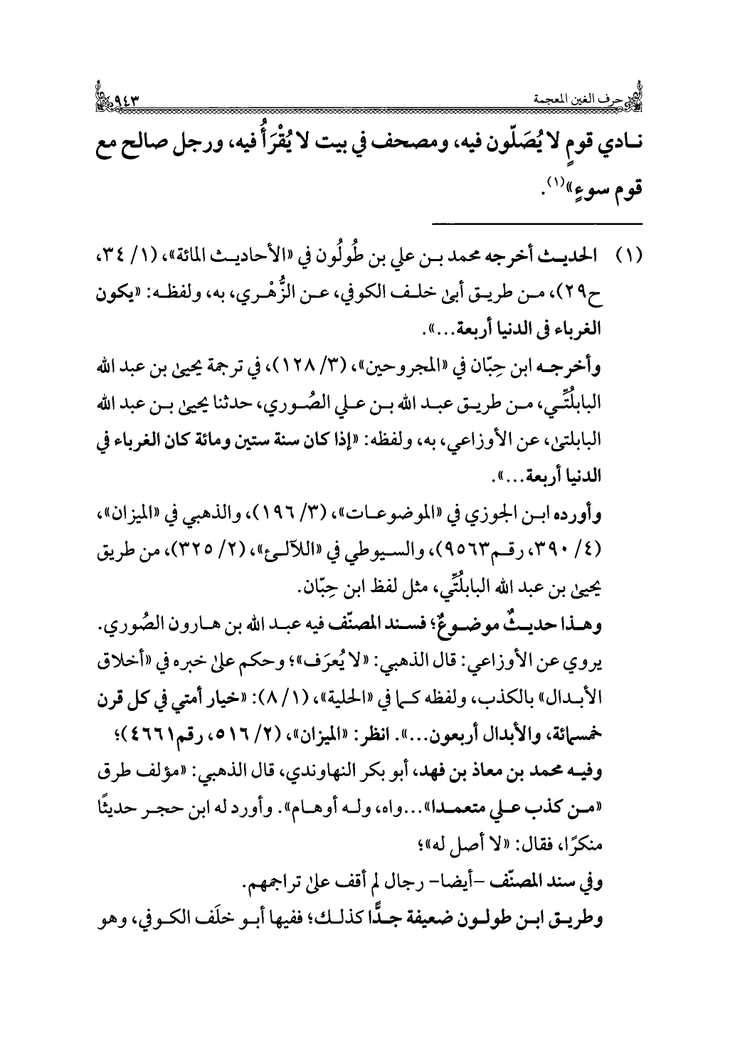 وأخرجه ابن حِبّان في "المجروحين"، (٣/ ١٢٨)، في ترجمة يحيى بن عبد الله البابُلتِّي، من طريق عبد الله بن علي الصُوري، حدثنا يحيى بن عبد الله البابلتيّ، عن الأوزاعي، به، ولفظه: "إِذَا كان سنة ستين ومائة كان الغرباء في الدنيا أربعة ... ".