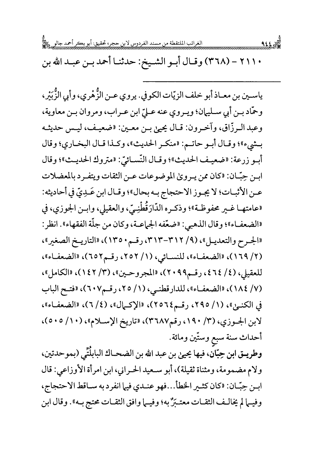 ياسين بن معاذ أبو خلف الزيّات الكوفي. يروي عن الزُّهْري، وأبي الزُّبَيْر، وحمّاد بن أبي سليمان، ويروي عنه عليّ ابن عراب، ومروان بن معاوية، وعبد الرزّاق، وآخرون: قال يحيى بن معين: "ضعيف، ليس حديثه بشيء"، وقال أبو حاتم: "منكر الحديث"، وكذا قال البخاري؛ وقال أبو زرعة: "ضعيف الحديث"؛ وقال النّسائيّ: "متروك الحديث"؛ وقال ابن حِبّان: "كان ممن يروى الموضوعات عن الثقات ويتفرد بالمعضلات عن الأثبات، لا يَجوز الاحتجاج به بحال"؛ وقال ابن عَدِيّ في أحاديثه: "عامتها غير محفوظة"، وذكره الدّارَقُطْنِيّ، والعقيلي، وابن الجوزي، في "الضعفاء"؛ وقال الذهبي: "ضعّفه الجماعة، وكان من جلّة الفقهاء". انظر: "الجرح والتعديل"، (٩/ ٣١٢ - ٣١٣، رقم ١٣٥٠)، "التاريخ الصغير"، (٢/ ١٦٩)، "الضعفاء"، للنسائي، (١/ ٢٥٢، رقم ٦٥٢)، "الضعفاء"، للعقيلي" (٤/ ٤٦٤، رقم ٢٠٩٩)، "المجروحين" (٣/ ١٤٢)، "الكامل"، (٧/ ١٨٤)، "الضعفاء"، للدارقطني، (١/ ٢٥، رقم ٦٠٧)، "فتح الباب في الكنى"، (١/ ٢٩٥، رقم ٢٥٦٤)، "الإكمال"، (٤/ ٦)، "الضعفاء"، لابن الجوزي" (٣/ ١٩٠، رقم ٣٦٨٧)، "تاريخ الإسلام"، (١٠/ ٥٠٥)، أحداث سنة سبعٍ وستّين ومائة.
