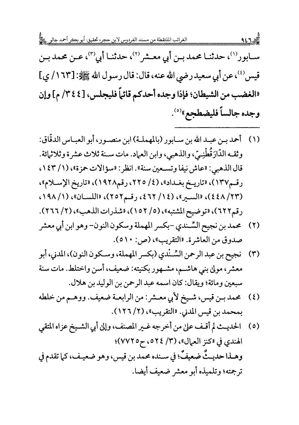 سابور (¬١)، حدثنا محمد بن أبي معشر (¬٢)، حدثنا أبي (¬٣)، عن محمد بن قيس (¬٤)، عن أبي سعيد رَضِيَ اللَّهُ عَنْهُ، قال: قال رسول الله -صَلَّى اللهُ عَلَيْهِ وَسَلَّمَ-: "الغضب من الشيطان؛ فإذا وجده أحدكم قَائِمًا فليجلس، وإن وجده جالسًا فليضطجع" (¬٥).